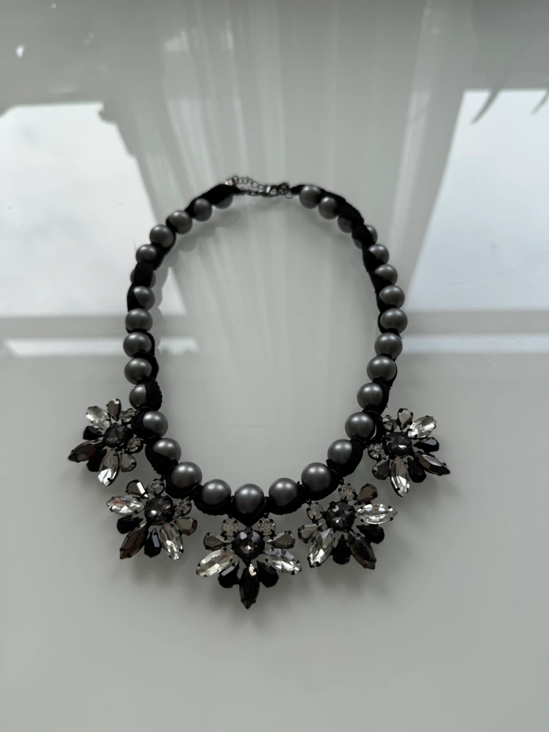 This is a beautiful statement necklace! It features grey beads and black floral accents with clear crystals. It's in great condition and would be a perfect addition to any outfit
