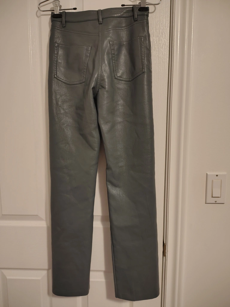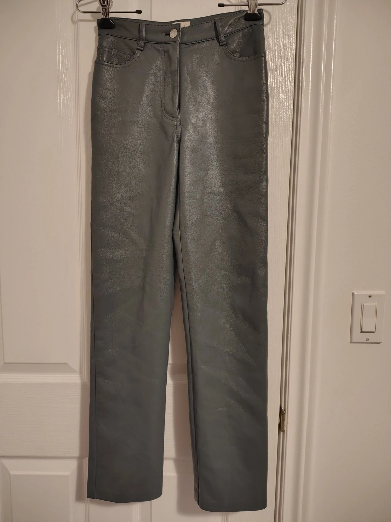 Selling a pair of Wilfred vegan leather pants in size 00. The pants are from the Aritzia Melina collection and are a stylish grey colour and made of vegan leather. They are in great condition and ready for a new home! They're if regular length
