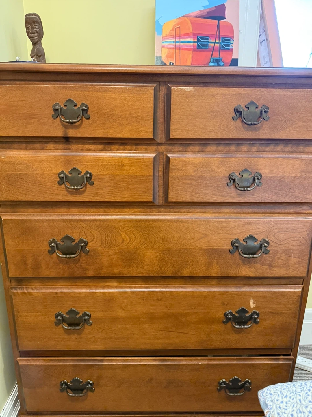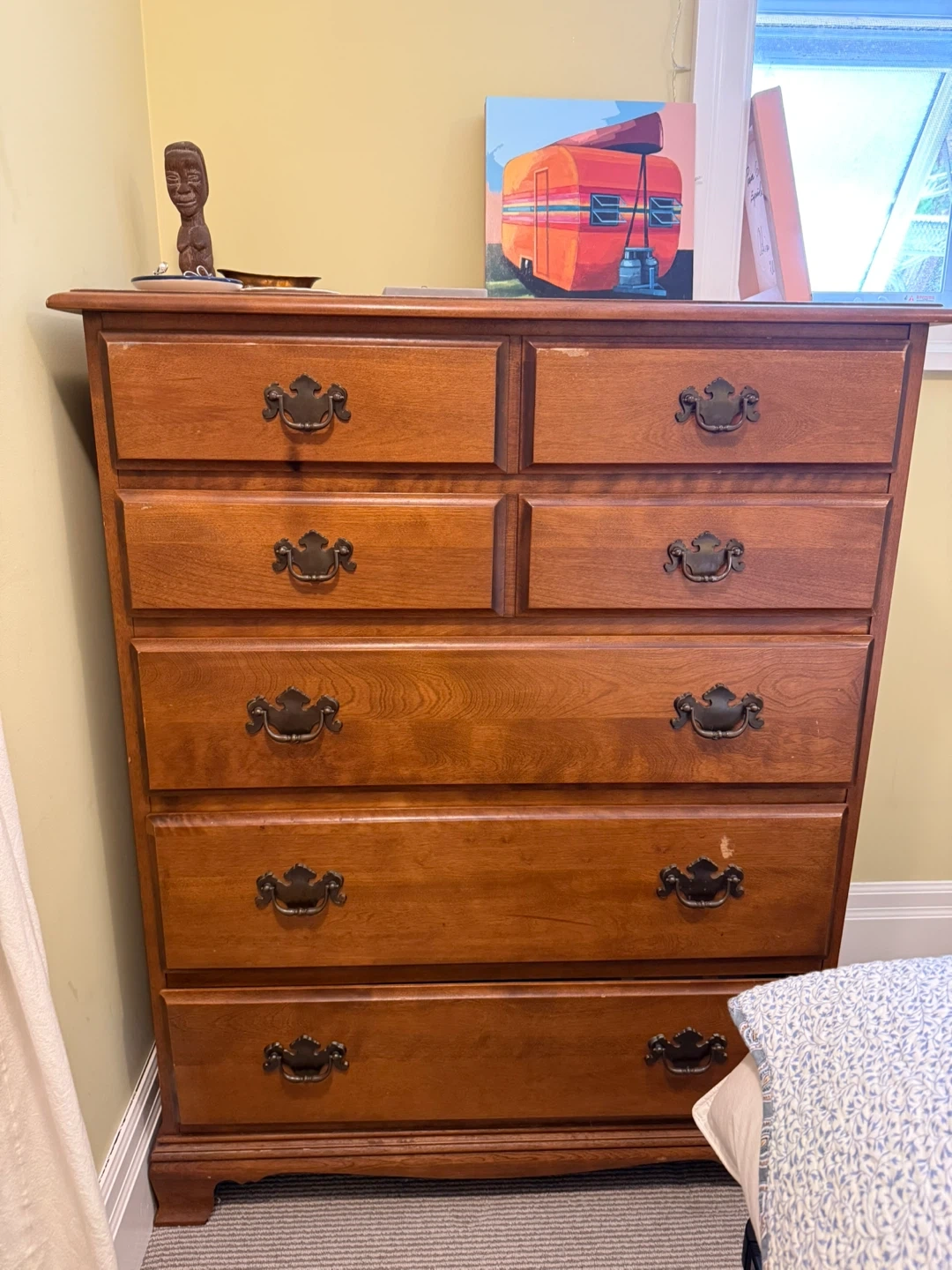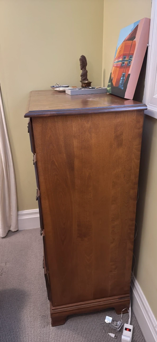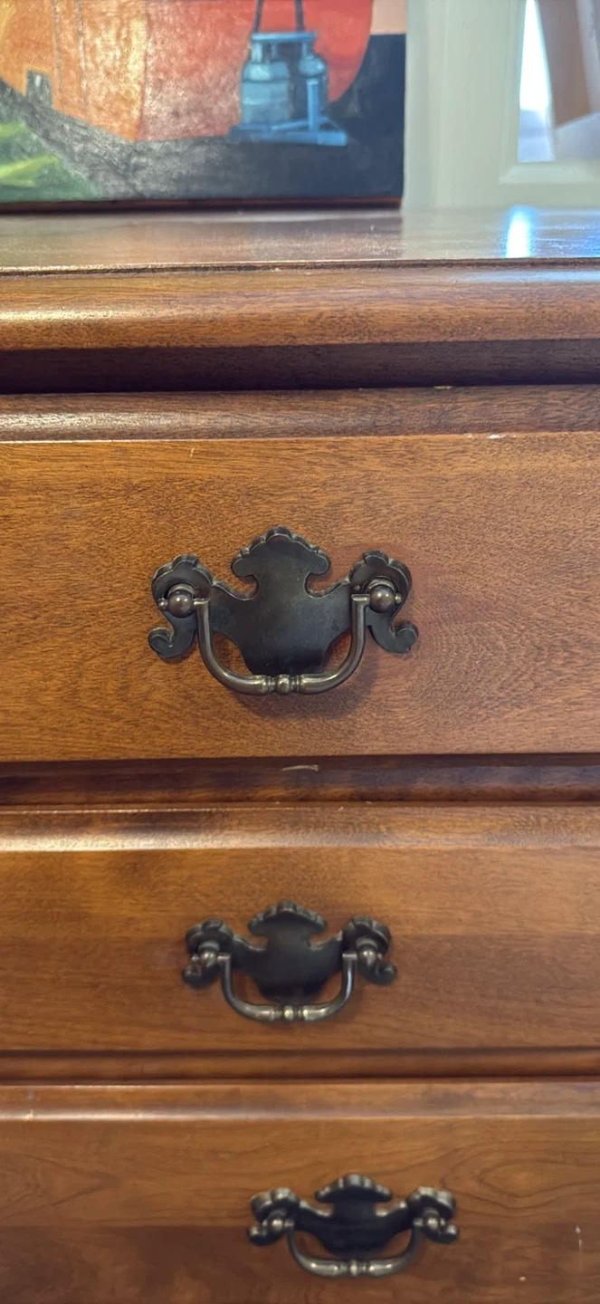 A sturdy wooden dresser with six drawers. It has a classic design with antique-style handles. Perfect for adding storage to any bedroom!