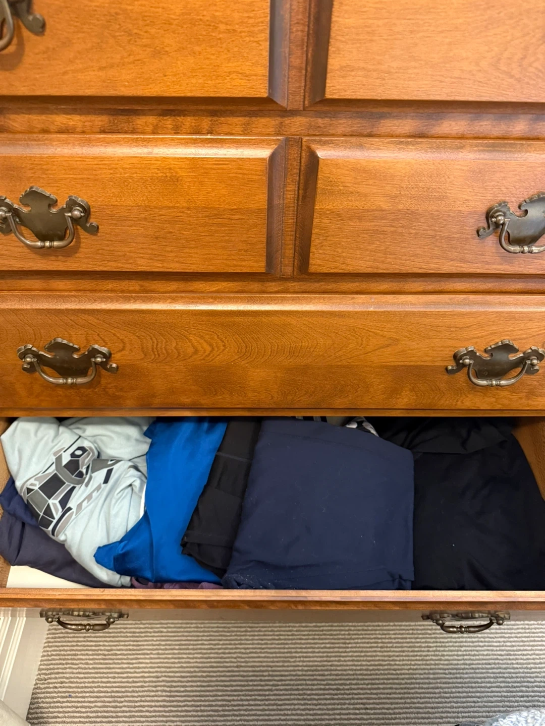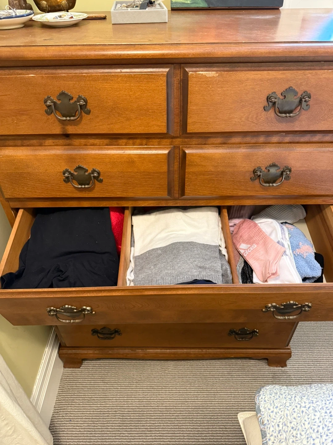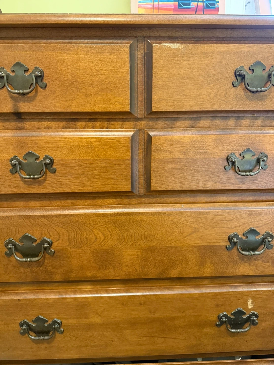 A sturdy wooden dresser with six drawers. It has a classic design with antique-style handles. Perfect for adding storage to any bedroom!