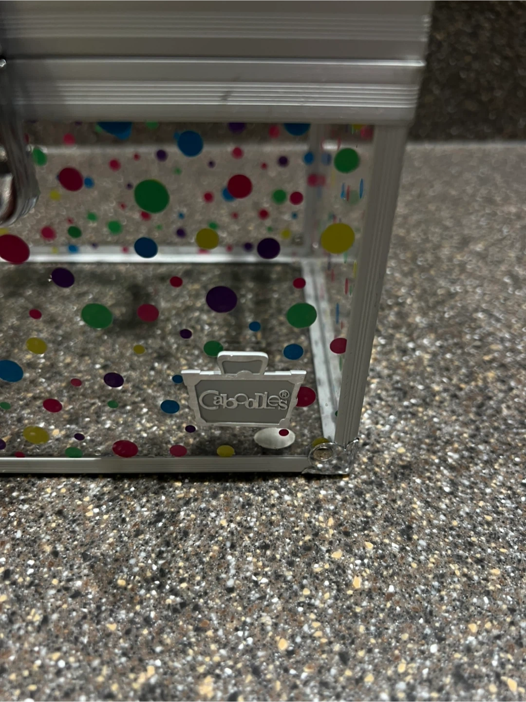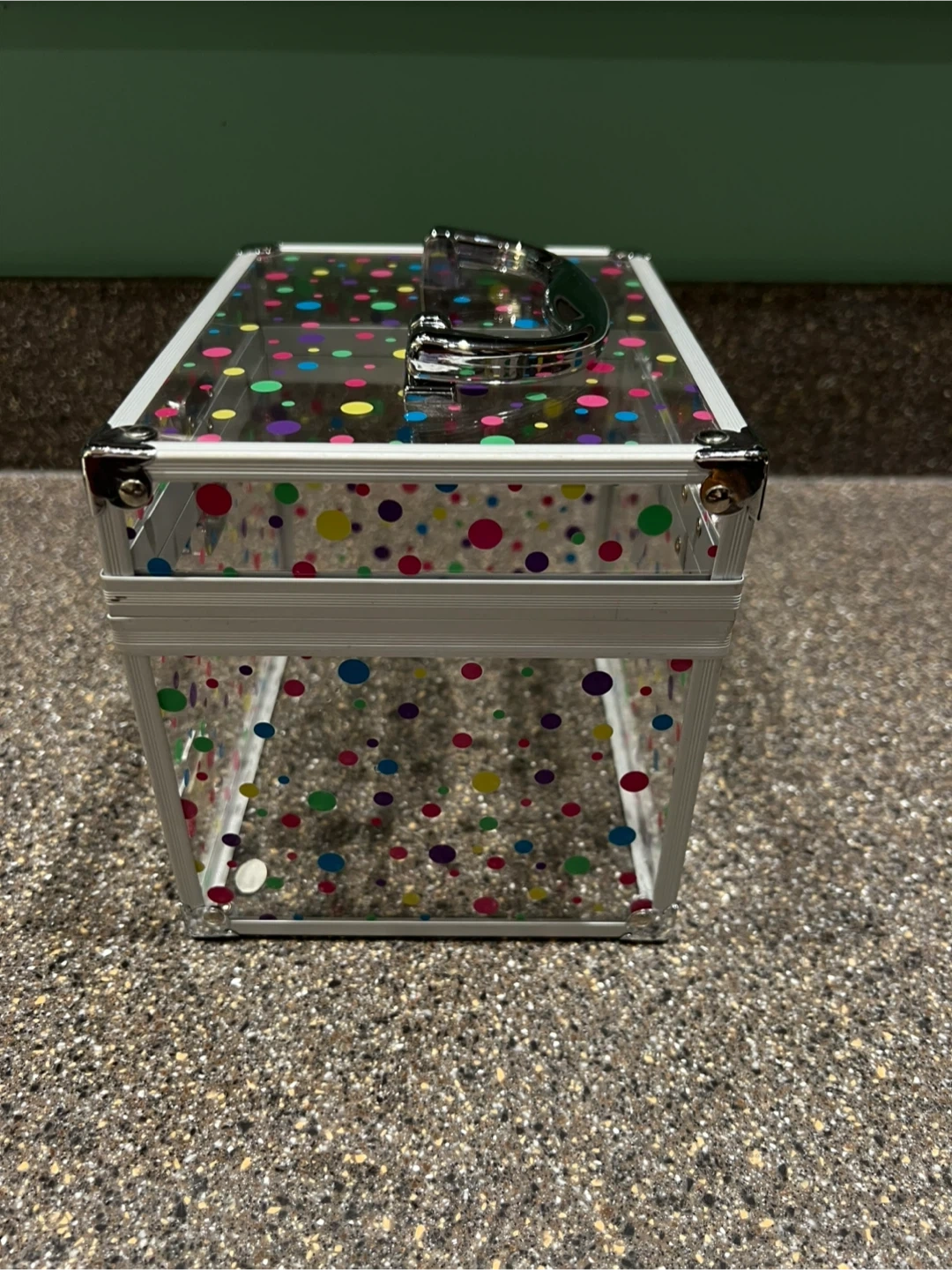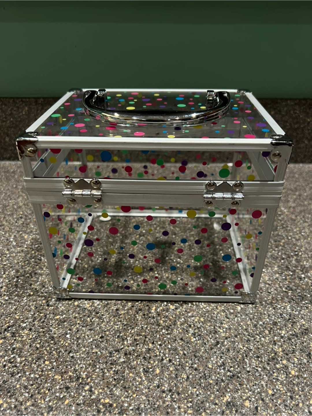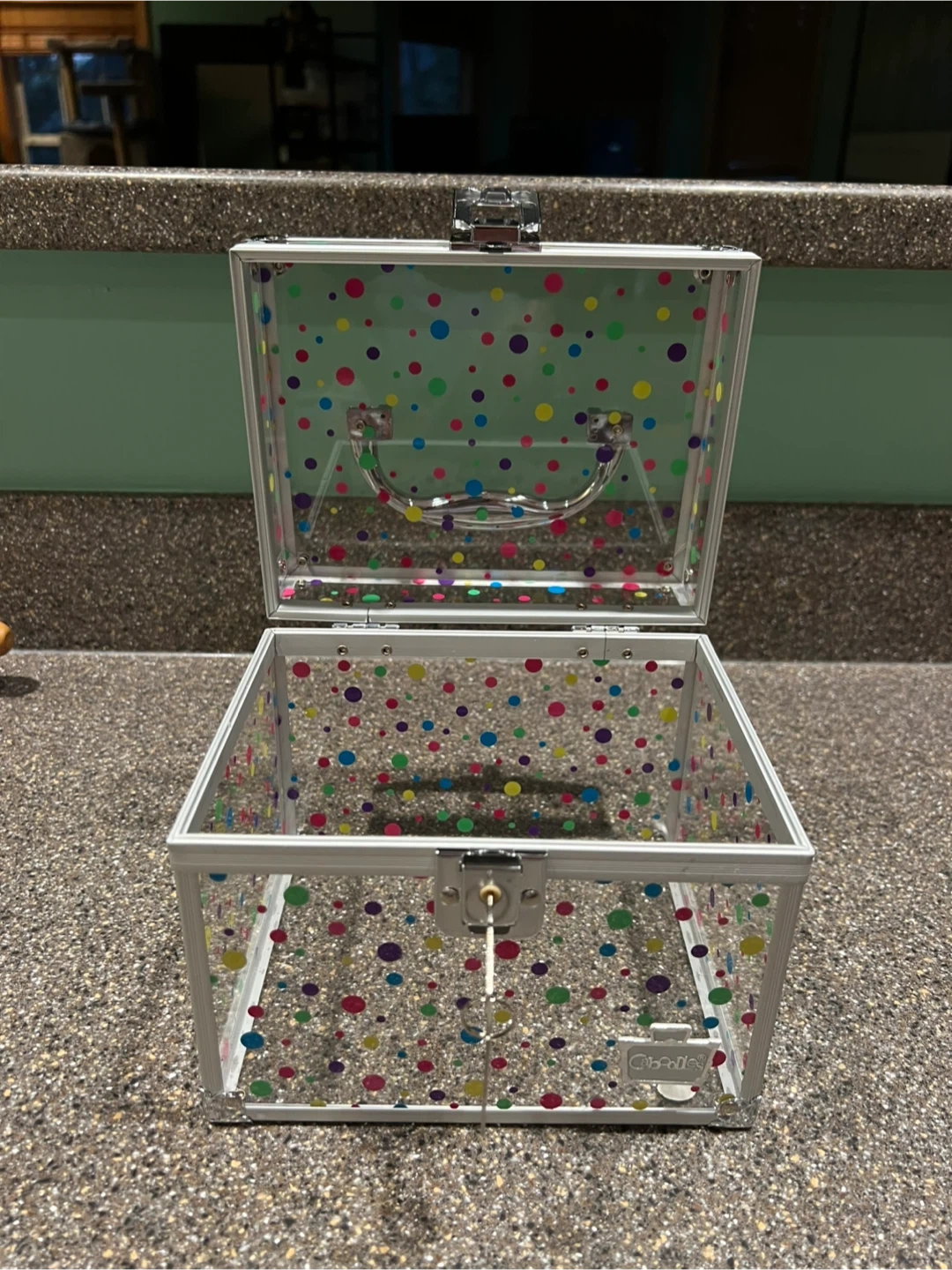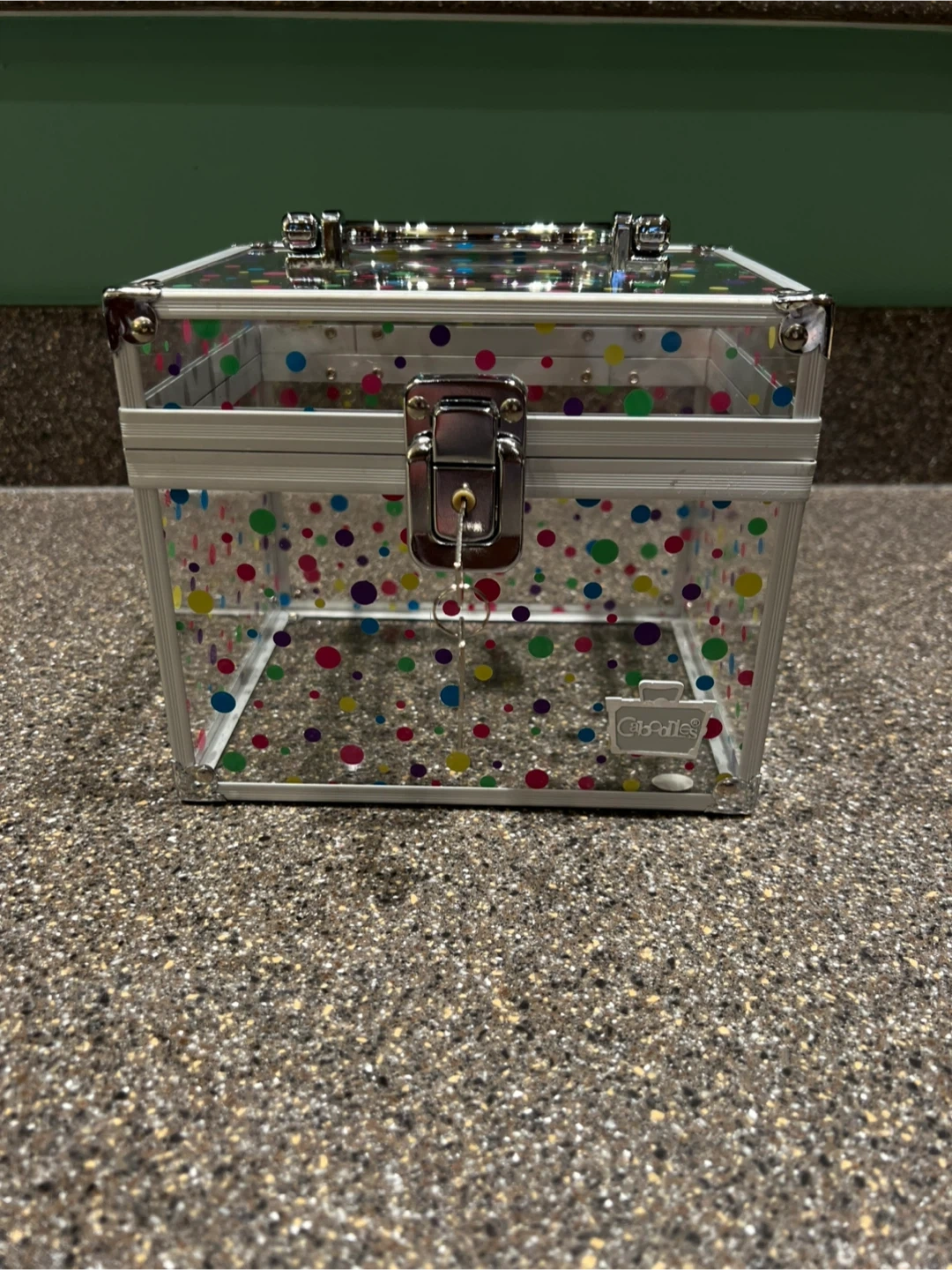 Clear/fun Dot Caboodle Box. Top carrying handle. Could be used for makeup, jewelry, hair accessories, or anything else. With keys