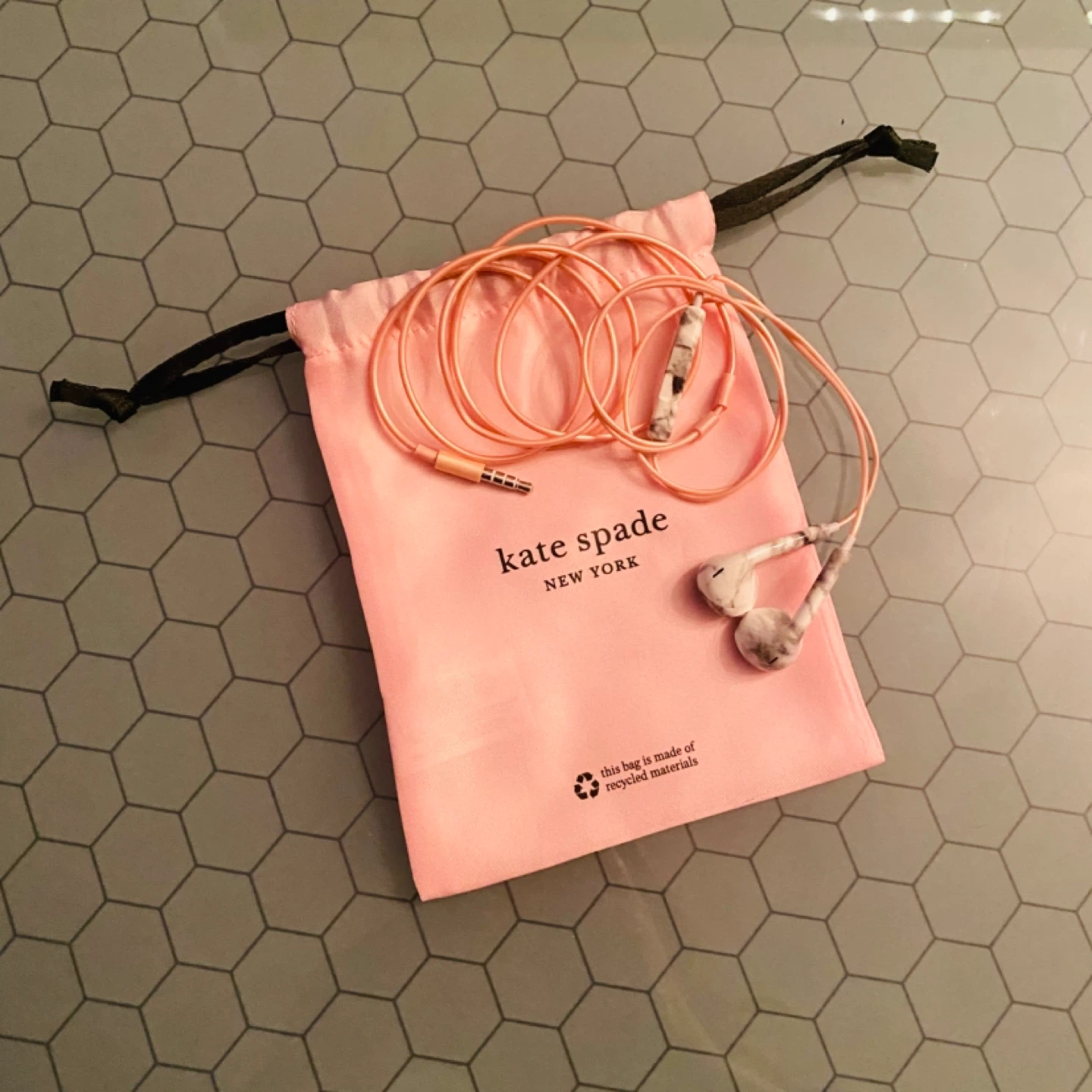 Gorgeous earbuds that come with a pretty Kate Spade pink carrying pouch! The earbuds themselves have a unique marbled design, and the cord is a lovely rose gold colour. Great sound and easy to use. Handy to have on airplanes for better sound quality as well 🎶