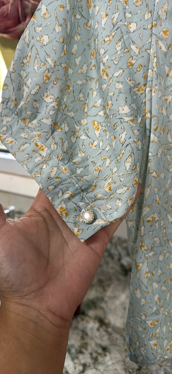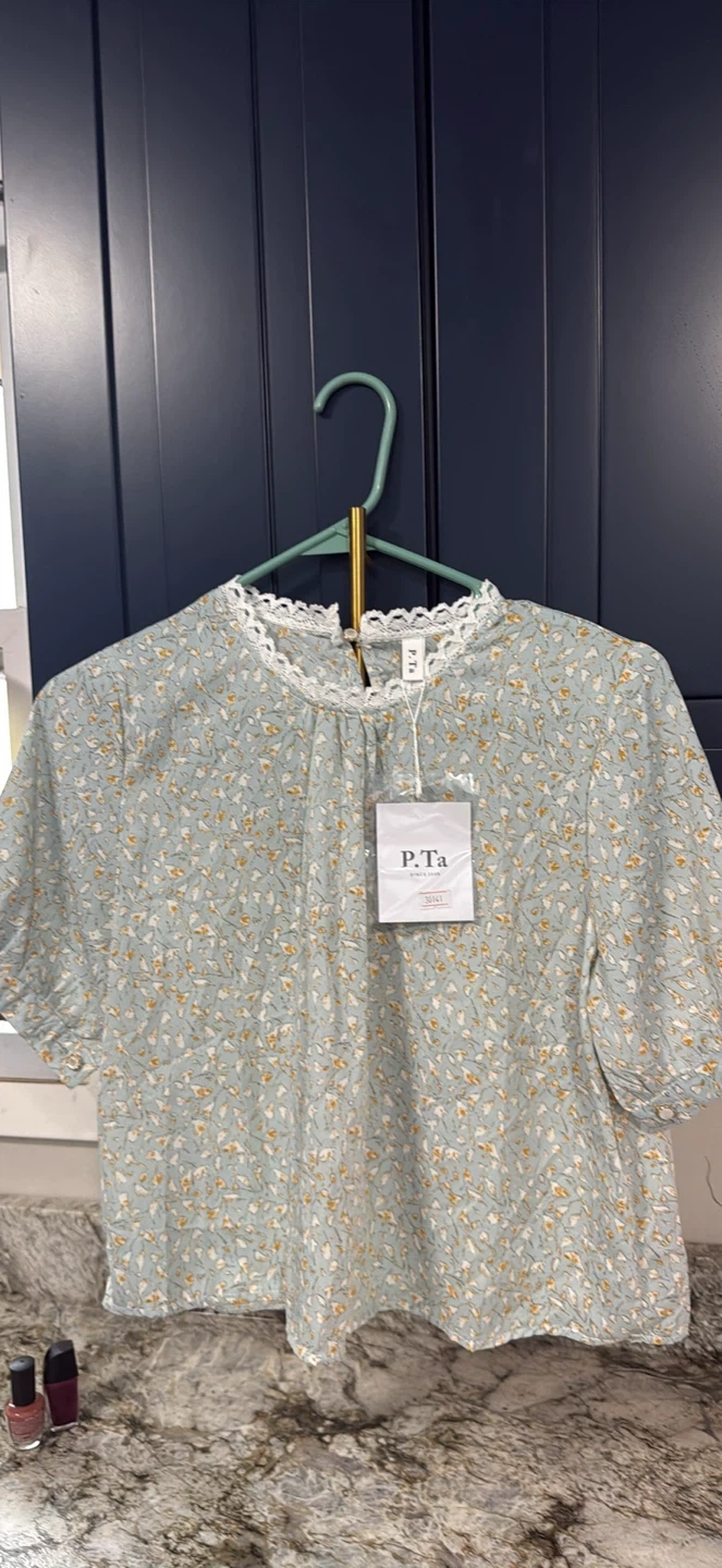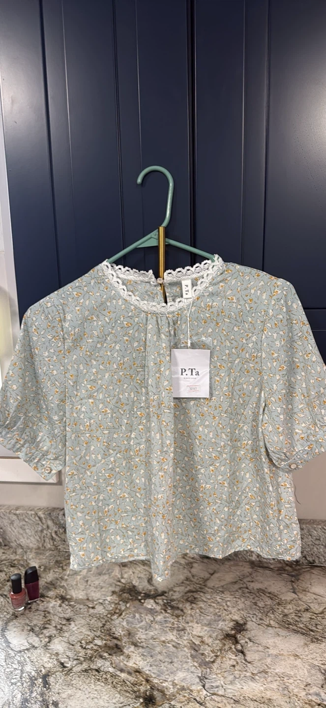 New Here's a cute floral print top from P.Ta! It has a delicate lace trim at the collar and pearl button details on the sleeves. It's in great condition and ready for a new home
