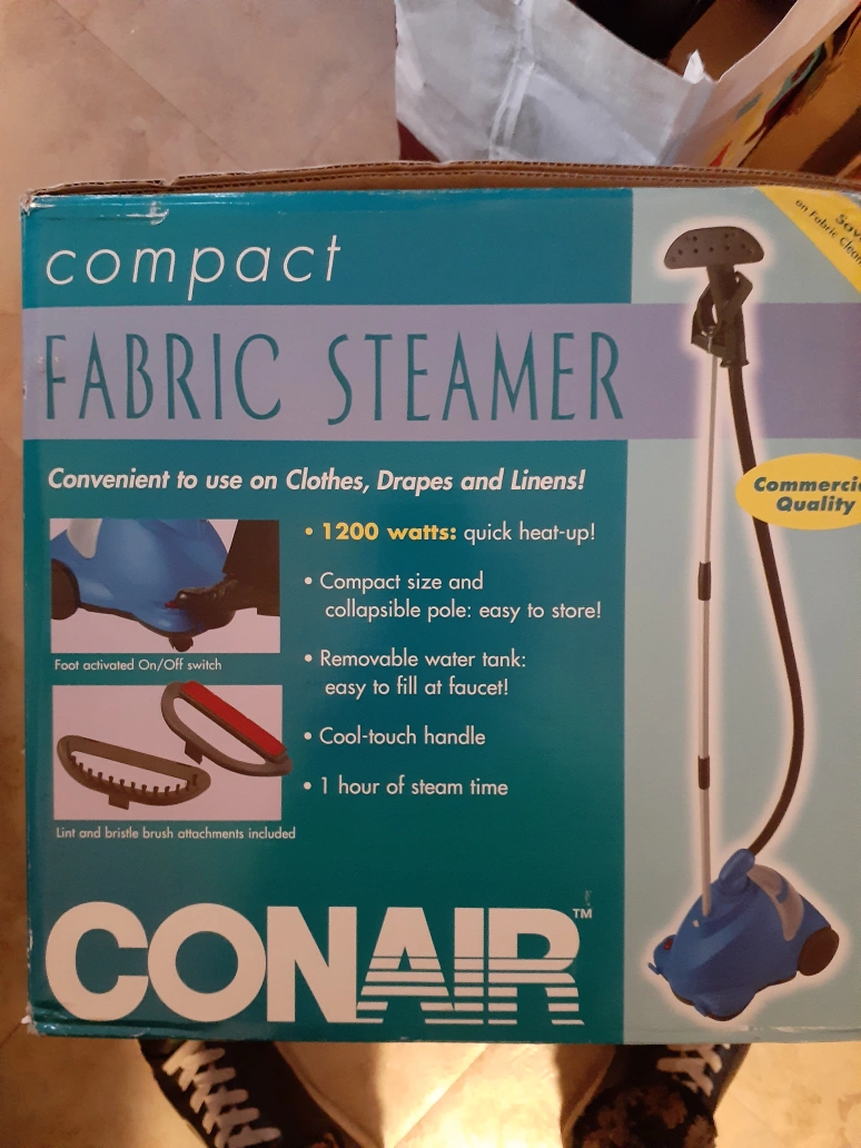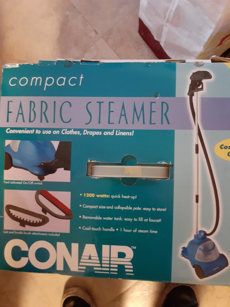 I'm selling a Conair Compact Fabric Steamer! It's convenient to use on clothes, drapes, and linens. Here are some features: