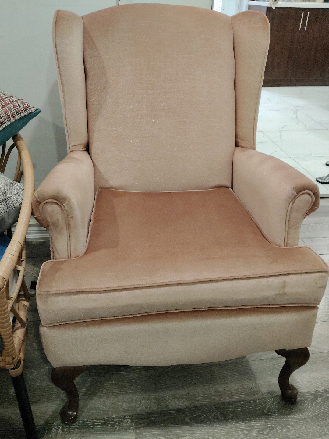 Giving away a comfy wingback armchair. It's a lovely peach colour with a soft velvet feel. Perfect for a reading nook or living room!