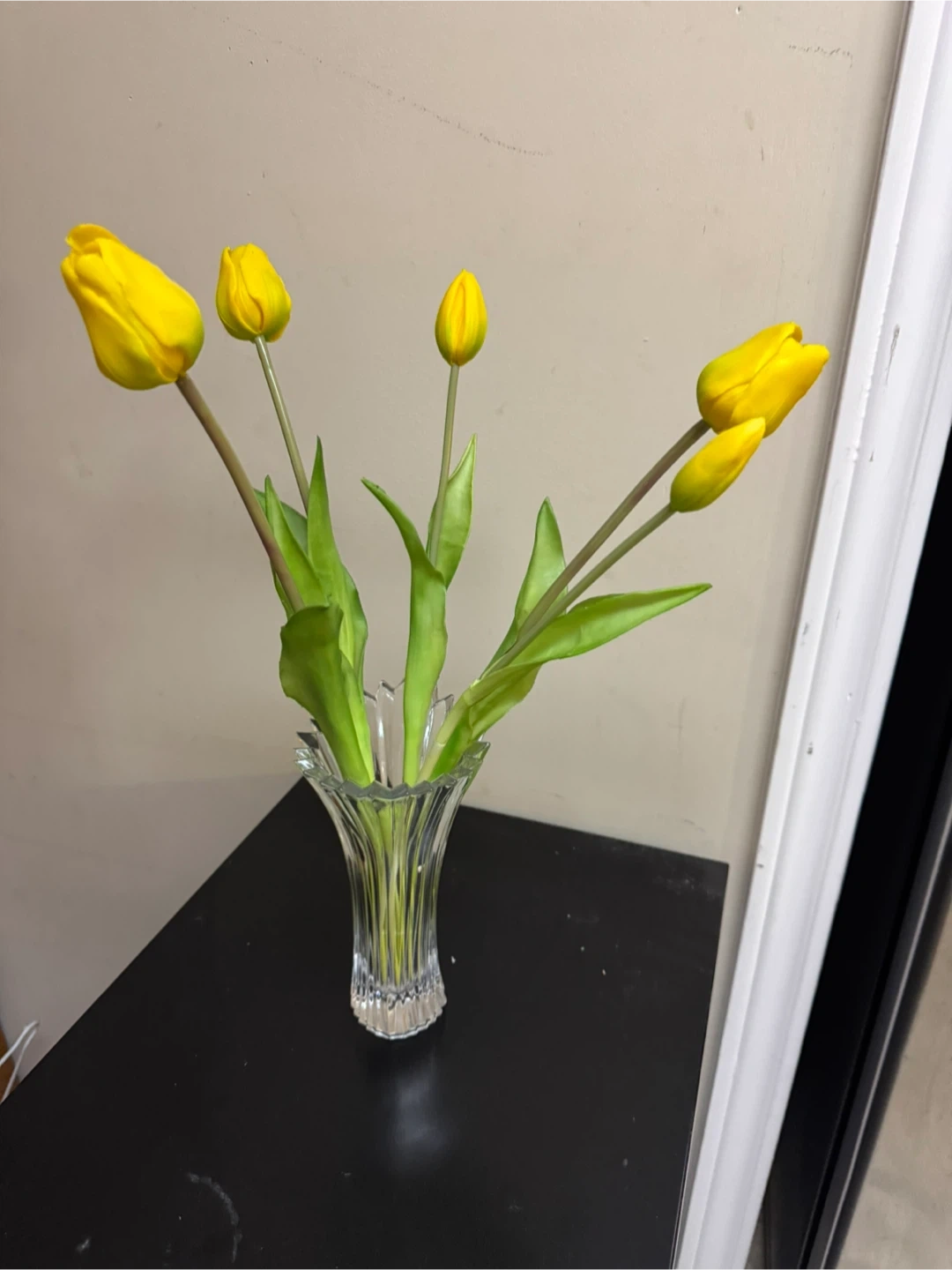 A lovely bunch of bright yellow tulips arranged in a clear glass vase. They'd be perfect for adding a touch of spring to any room!