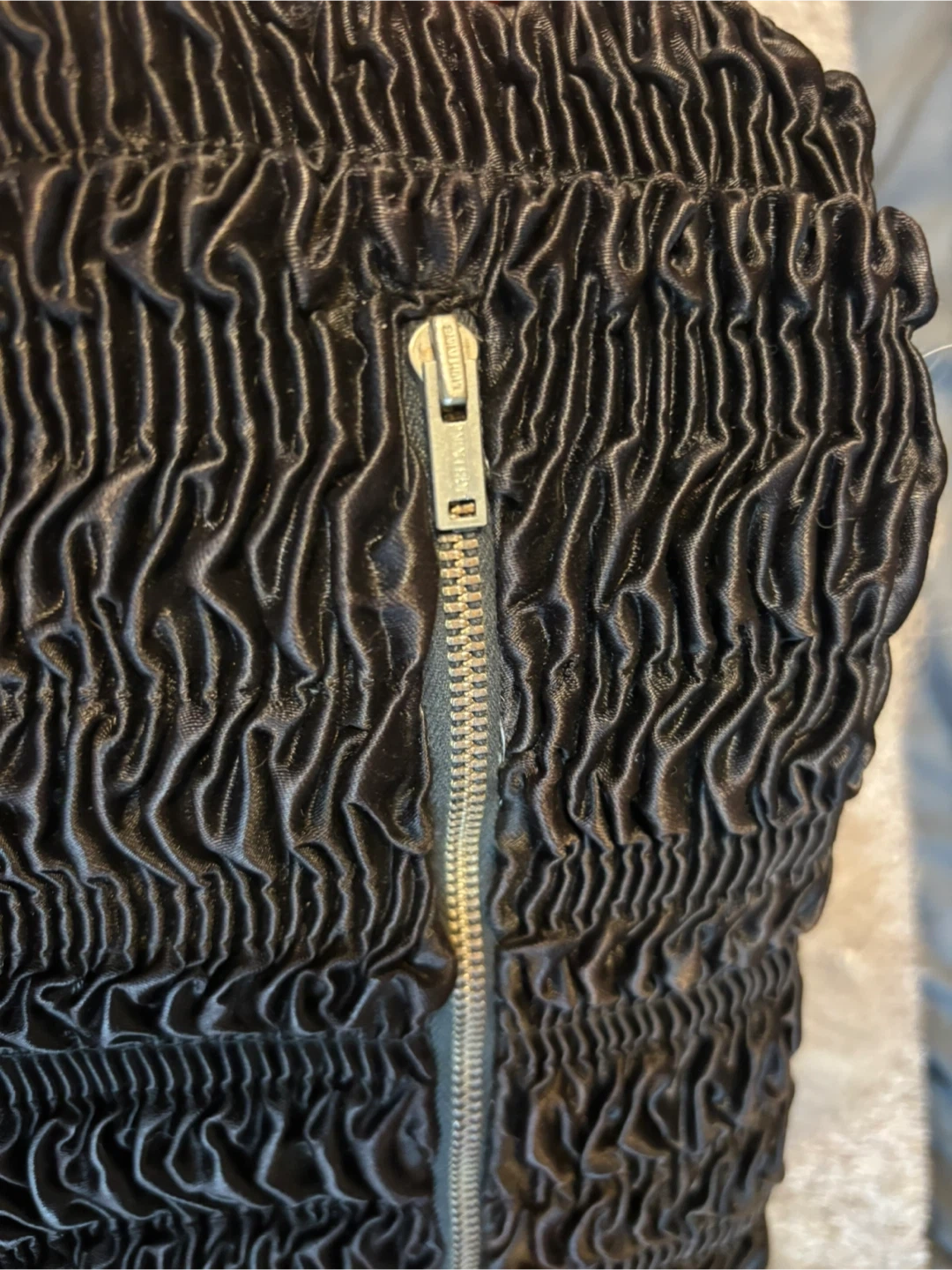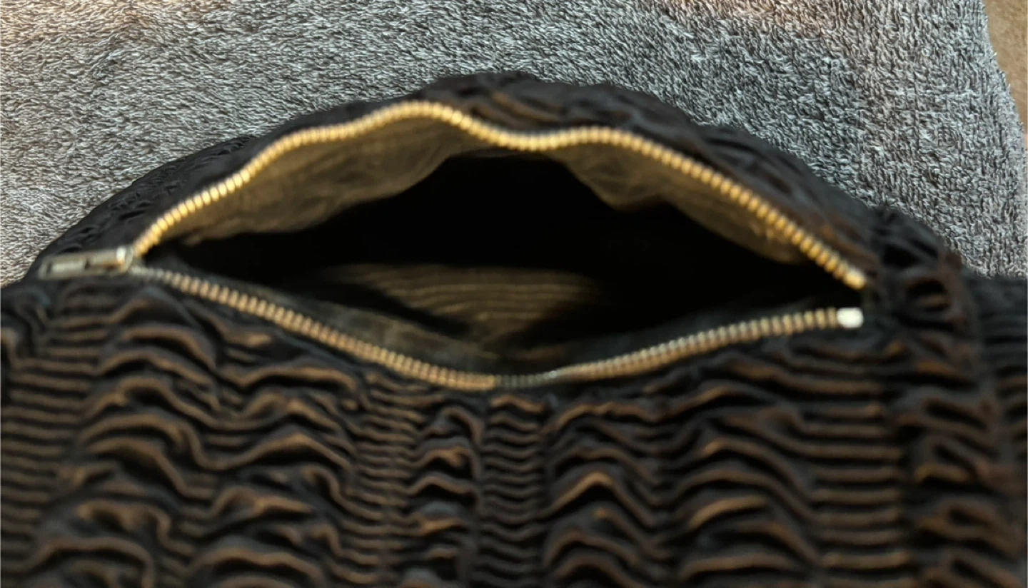 Vintage fur muffin It features a distinctive textured pattern and a gold-tone zipper. The interior is lined with a smooth black fabric, for keeping hands warm. Perfect for adding a touch of elegance to your outfit!