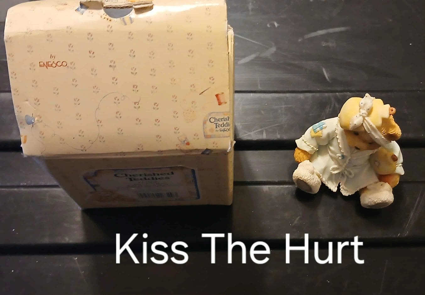 Selling a cute Enesco Cherished Teddies figurine named 'Kiss The Hurt'! It comes with its original box. A sweet addition to any collection or a thoughtful gift for someone special