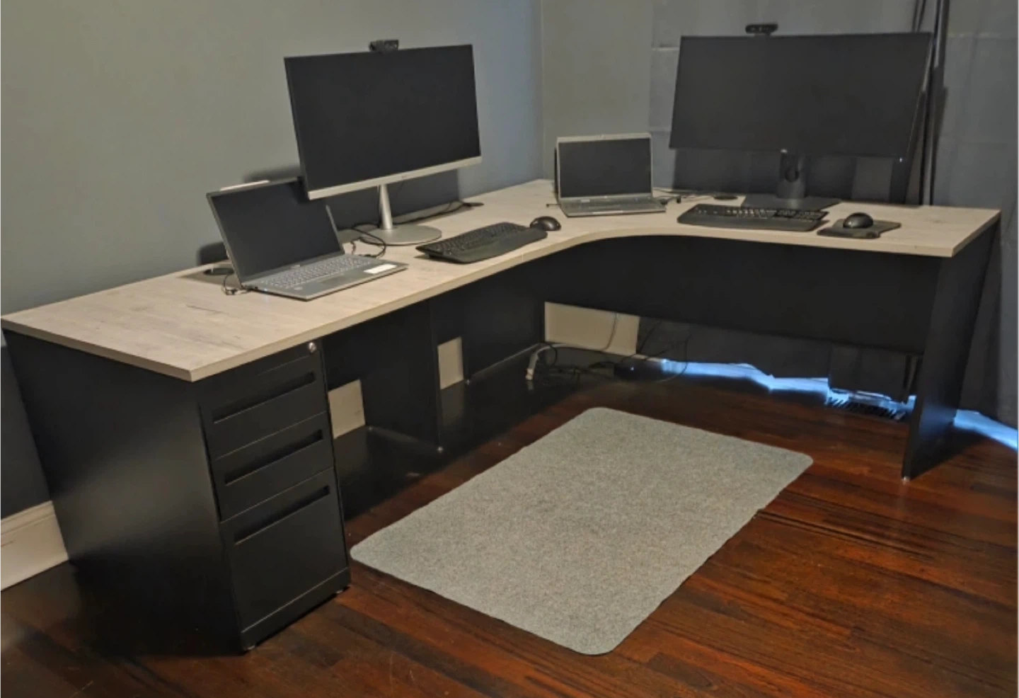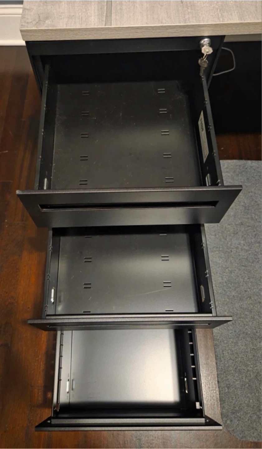 Selling an NBF Signature Series metal & wood L-shaped desk. It comes with locking drawers & a file cabinet for storage. The desk is in great shape condition and is perfect for a home office or workspace.
