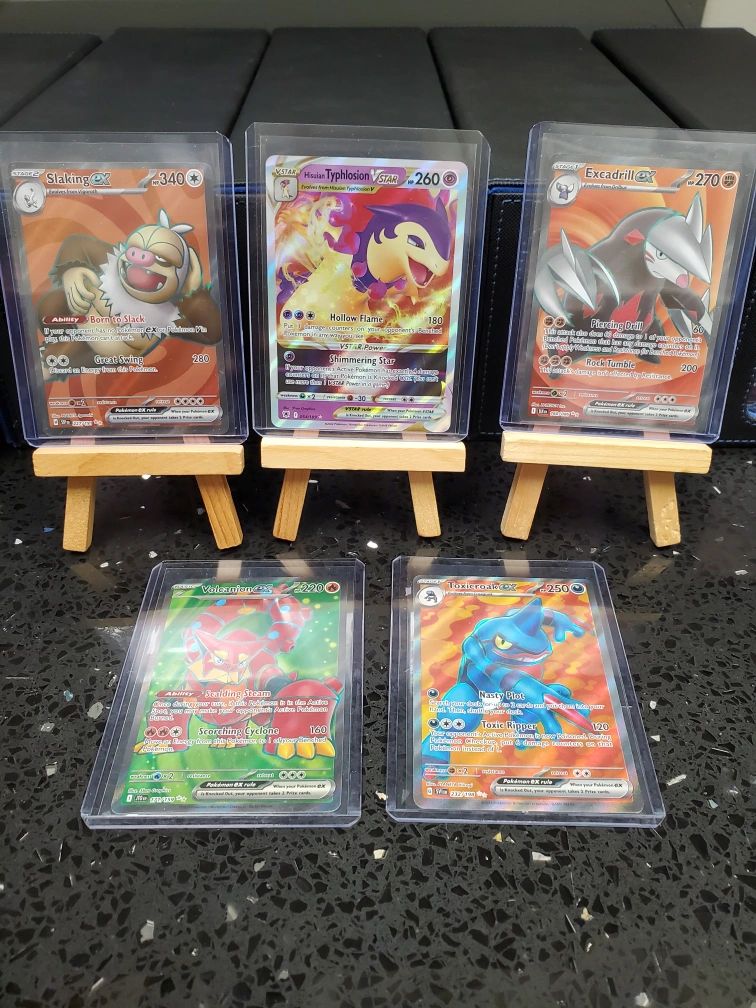 Selling a set of Pokémon EX cards! You'll get Slaking EX, H-Typhlosion EX, Excadrill EX, Volcanion EX, and Toxicroak EX. They are in great condition and ready for a new home! Perfect for collectors or players