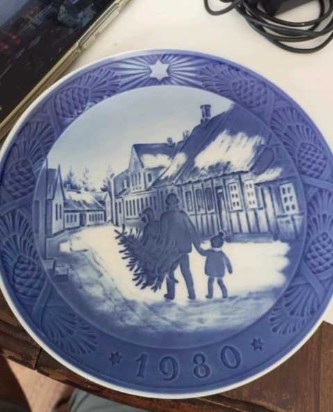Selling a Bing & Grondahl Christmas plate from 1980! It features a lovely blue and white design of a family bringing home a Christmas tree. It's in great condition and would make a wonderful addition to any collection