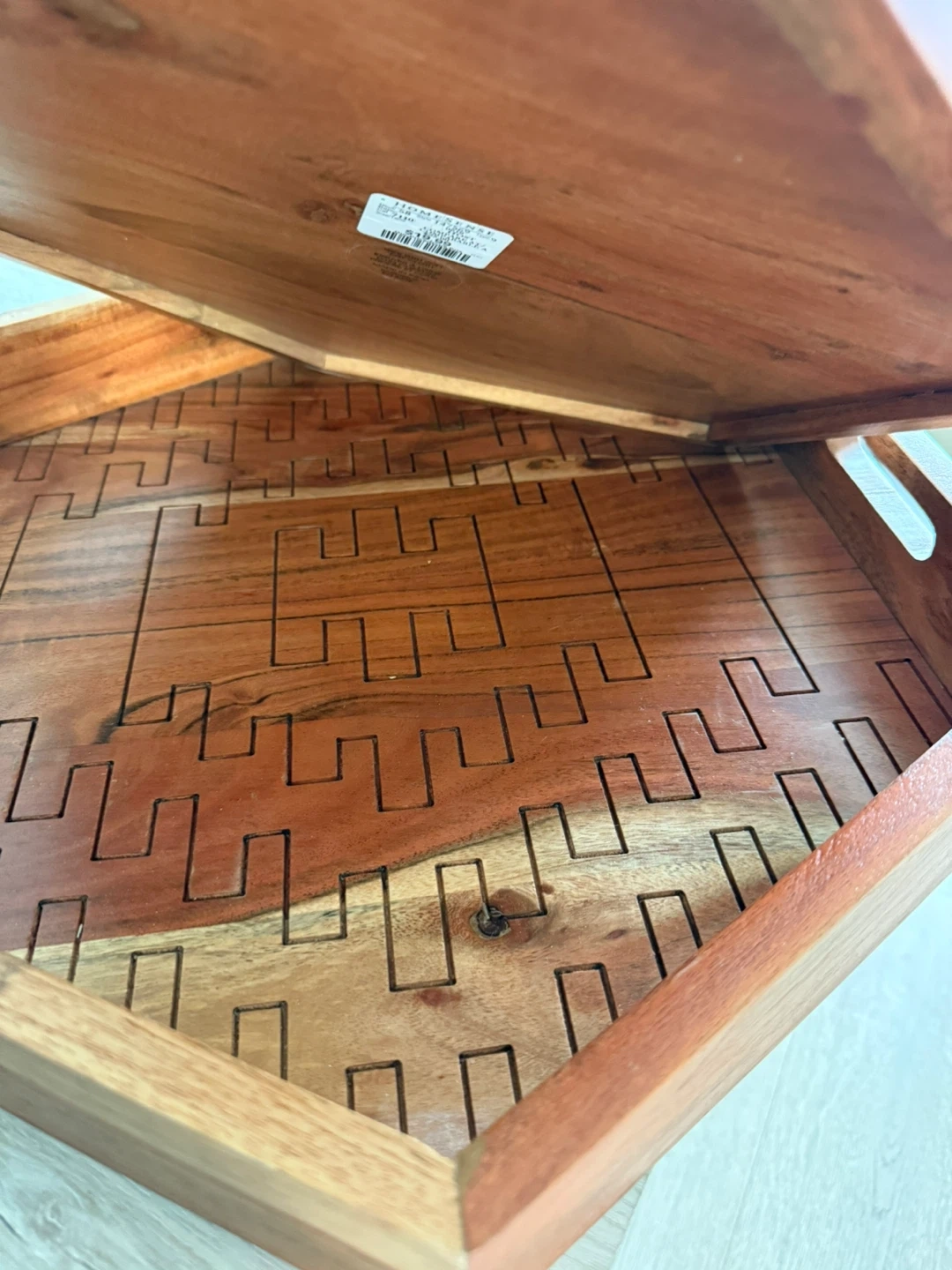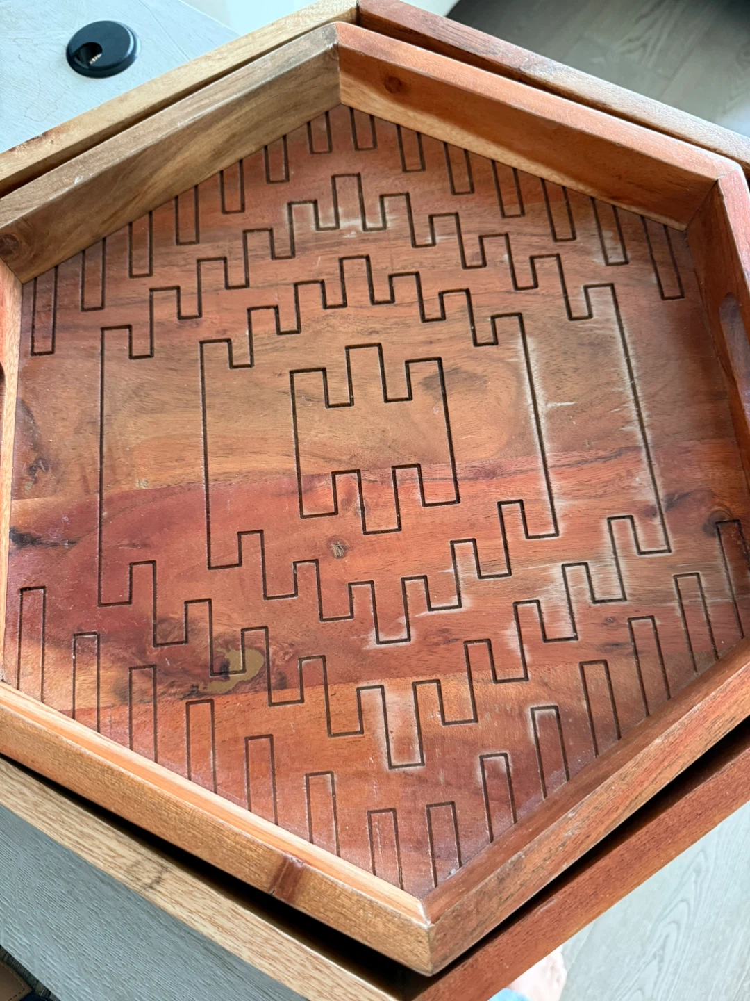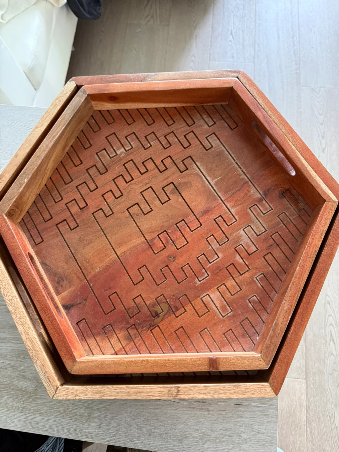 Selling a set of two hexagon-shaped wooden trays. They have a unique geometric design etched into the bottom. Great for serving or decor!