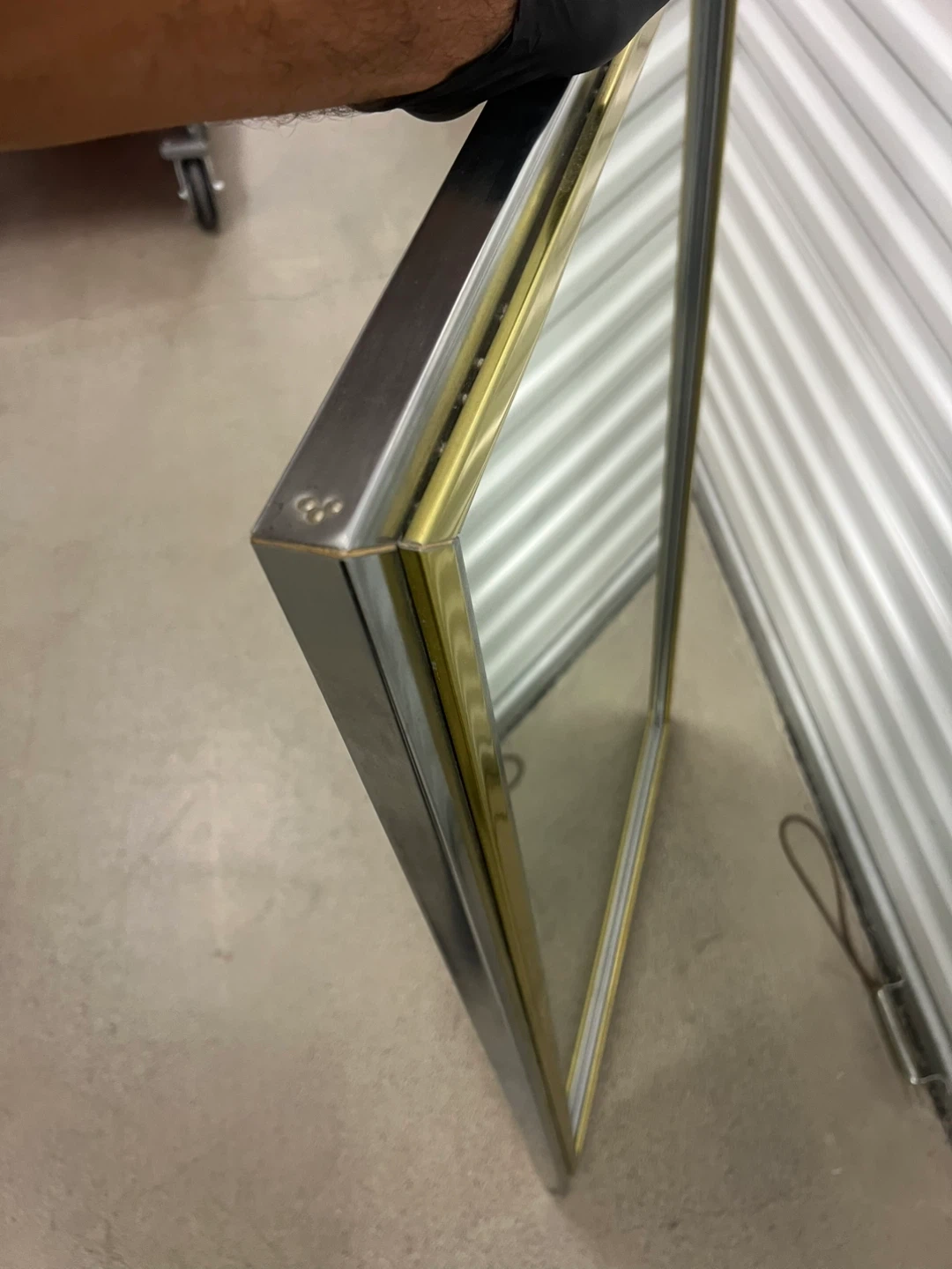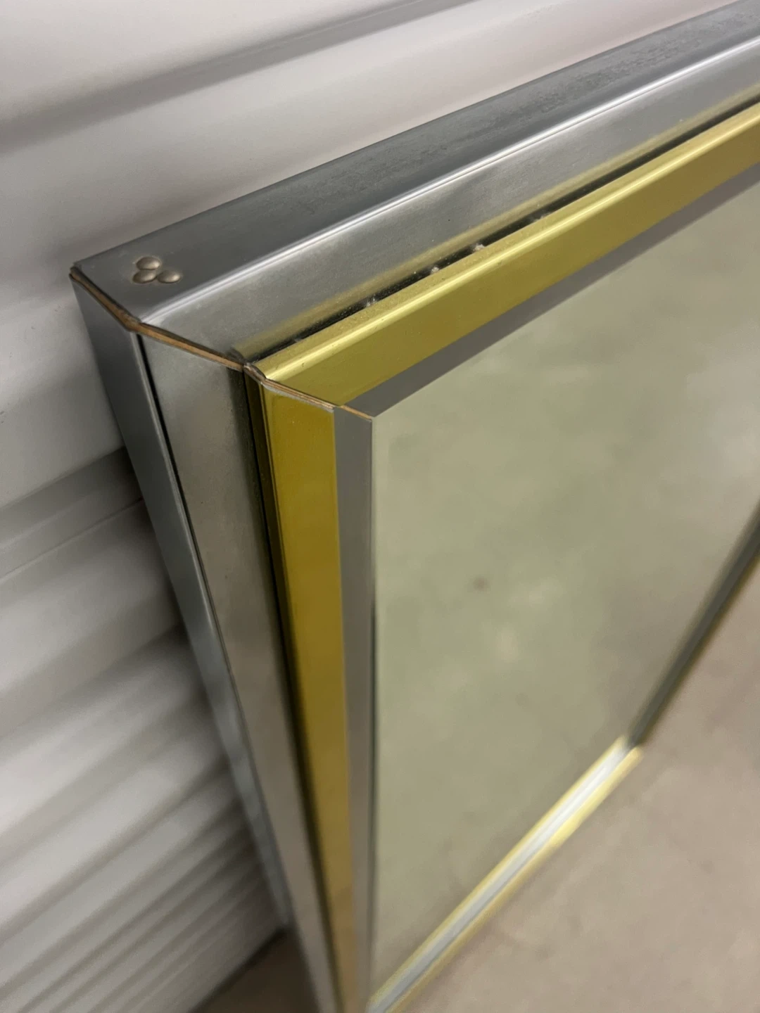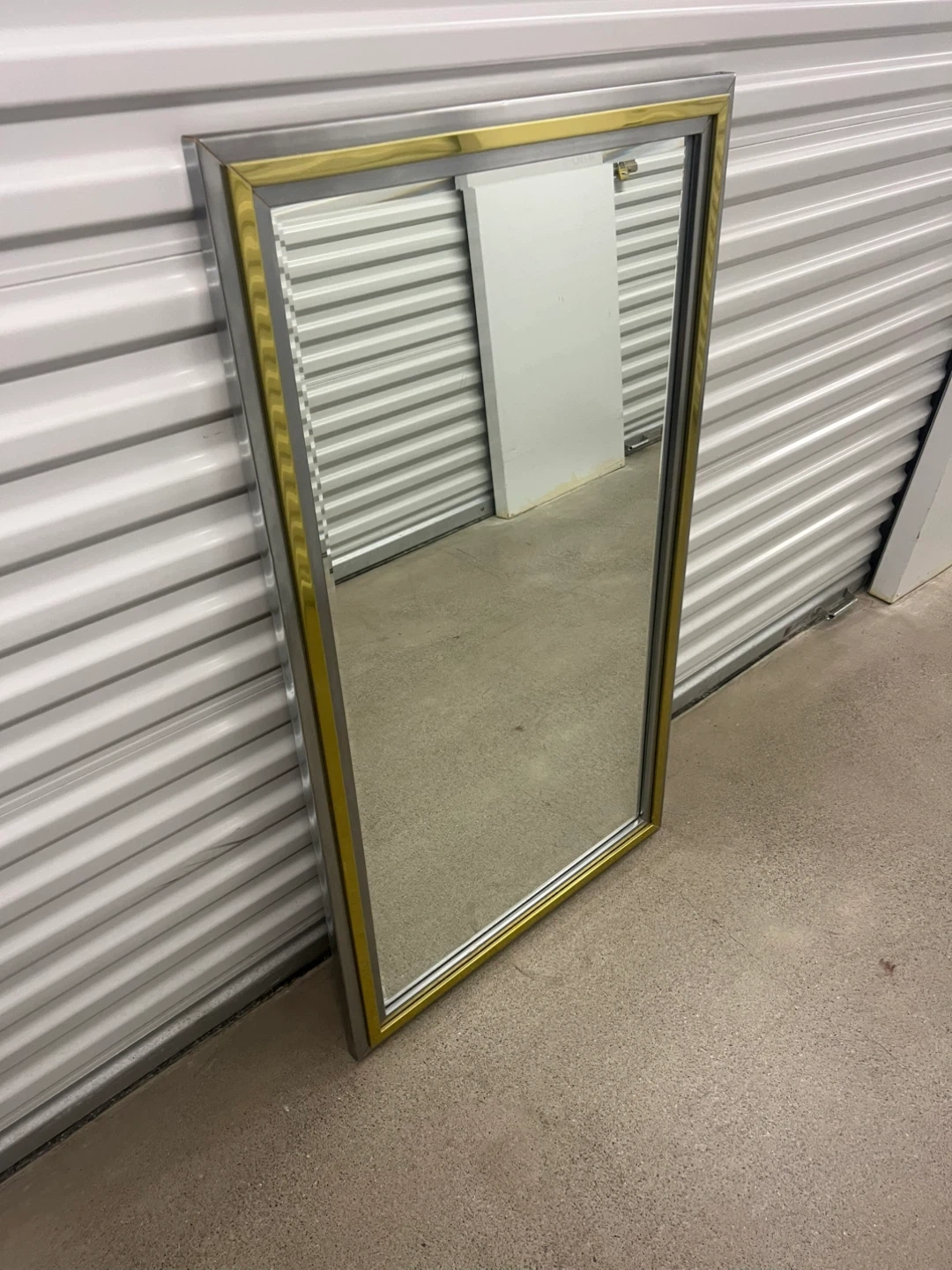 Selling a framed wall mirror with a gold and silver frame. The back has some wear and tear, as shown in the photos.