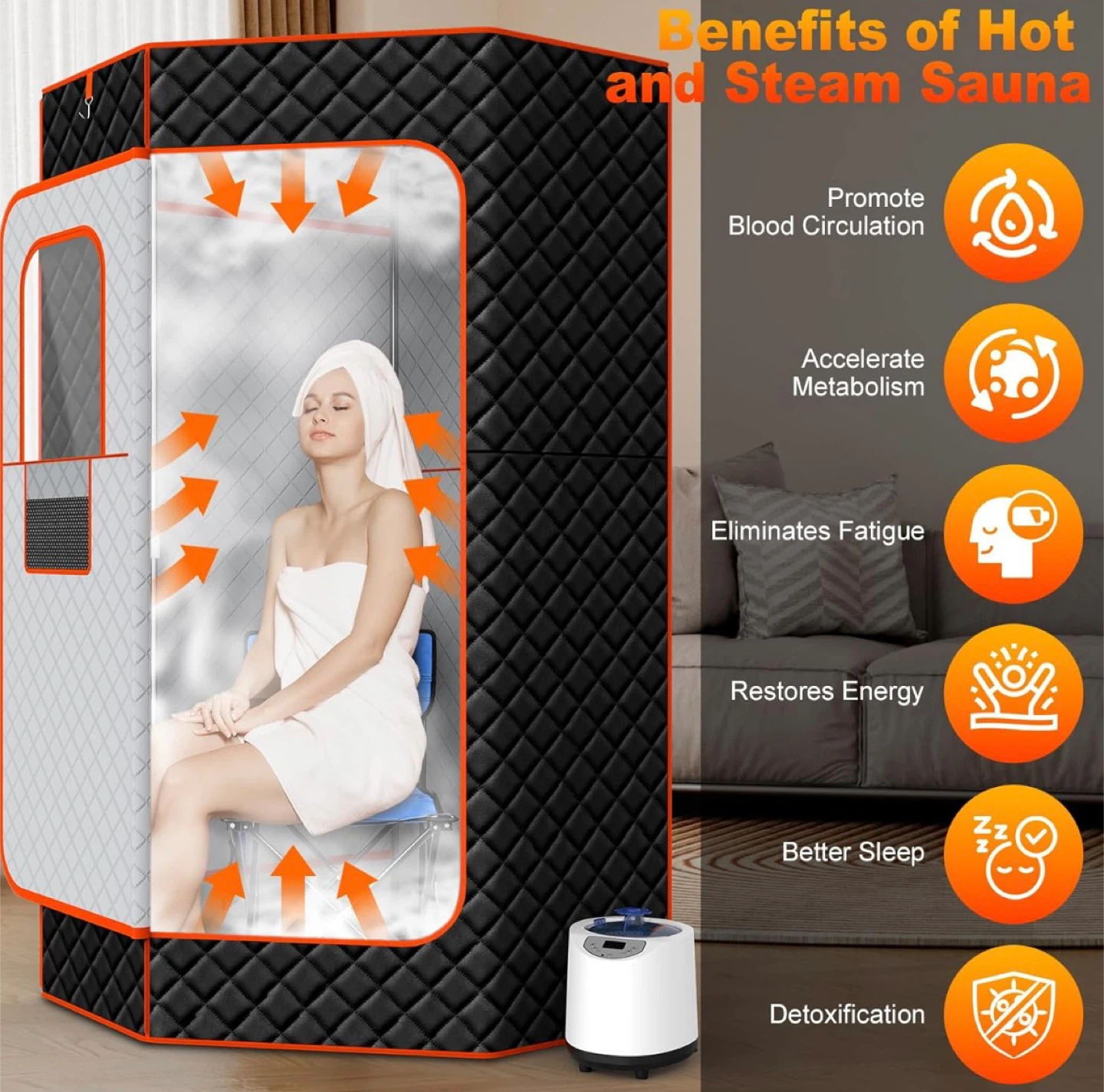 Selling a NEW iTHERAU XL Sauna Box! This portable sauna is perfect for home use and offers a full-body personal sauna experience. It comes with a 3L 1200W steamer, upgraded materials, remote control, 9 heat levels, a 90-minute timer, and even a comfy chair. The sauna is made with higher quality 450D Oxford cloth and features a stainless steel structure. It also has convenient pockets and hooks, a visual window, and double zippers.