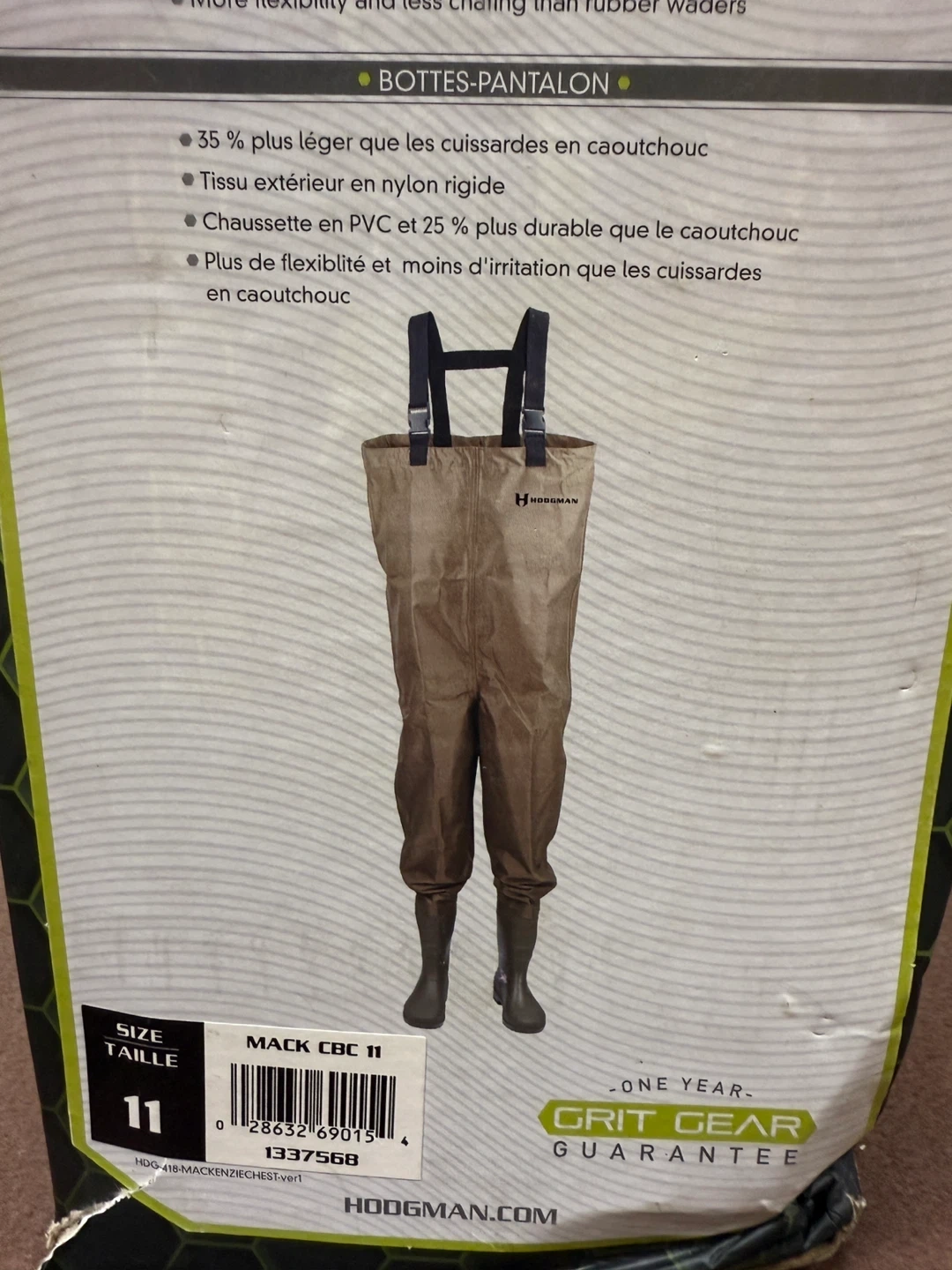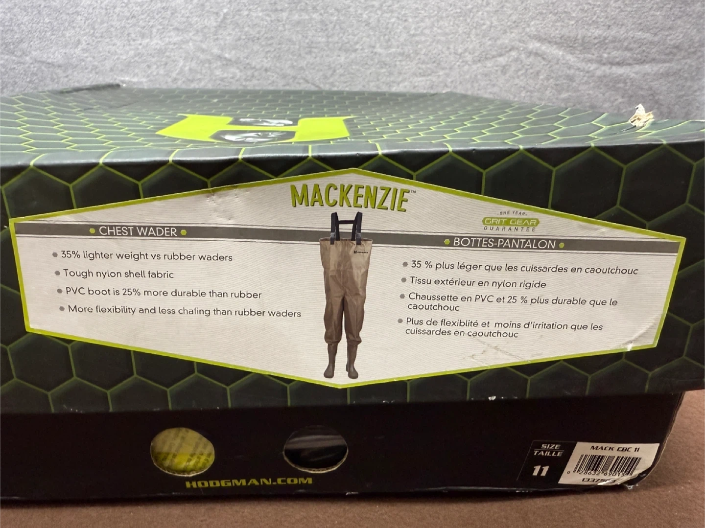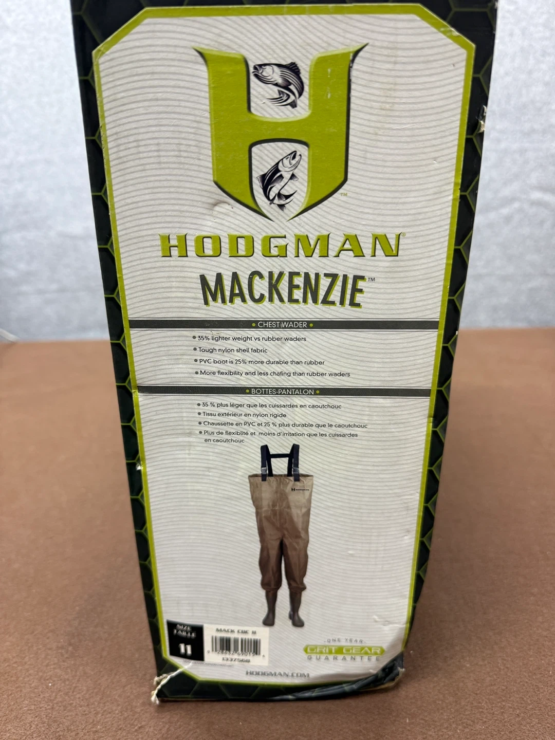 Selling a new Hodgman Mackenzie chest wader in size 11. This chest wader is 35% lighter than rubber waders and has tough nylon shell fabric. The PVC boot is 25% more durable than rubber and offers more flexibility and less chafing than rubber waders. Comes with the original box