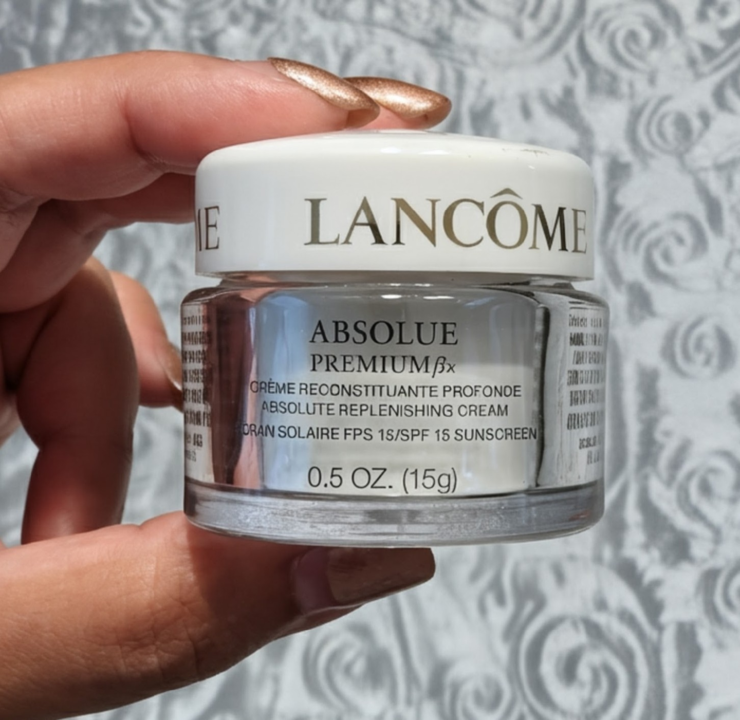 Selling a Lancôme Absolue Premium Bx Absolute Replenishing Cream. It's a crème reconstituante profonde with SPF 15 sunscreen. The size is 0.5 oz (15g). Apply daily before sun exposure!