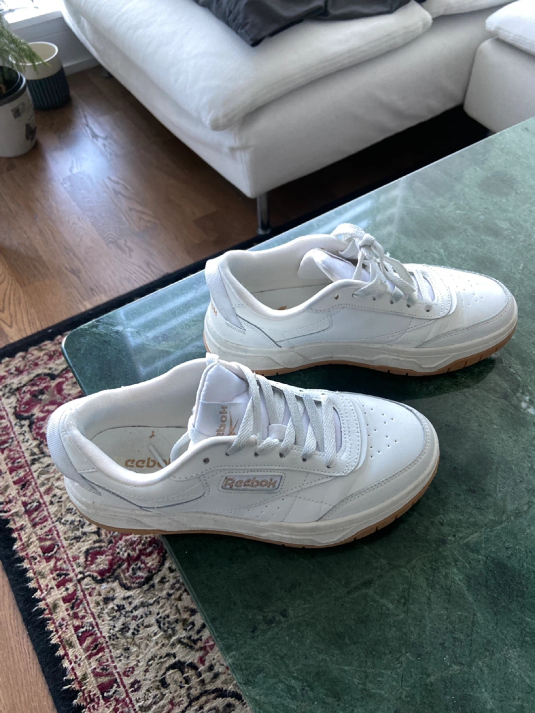 Selling a pair of Reebok Club Memt women's shoes in size 7. They are white with a gum sole. The shoes are in good condition and ready for a new home!