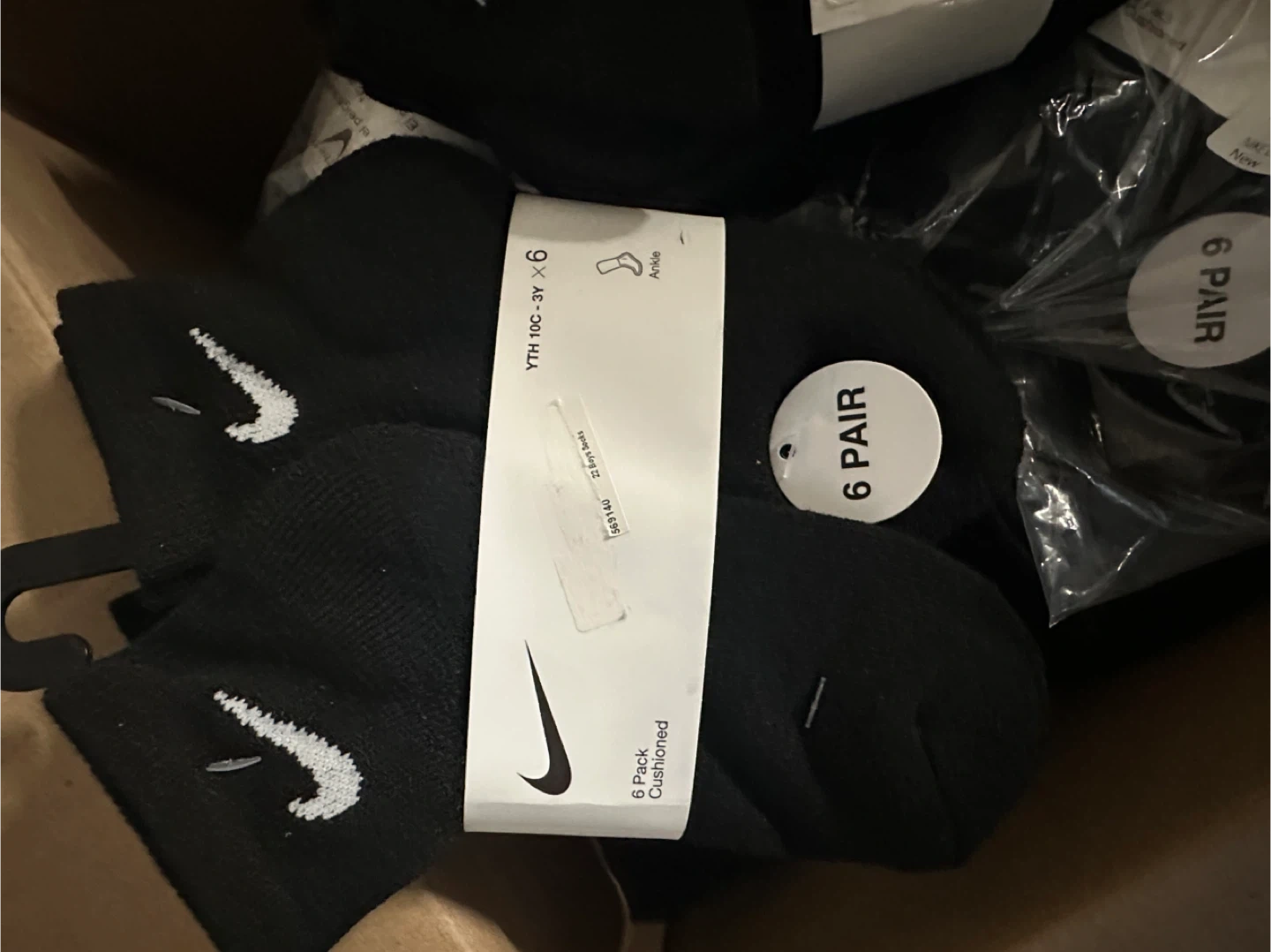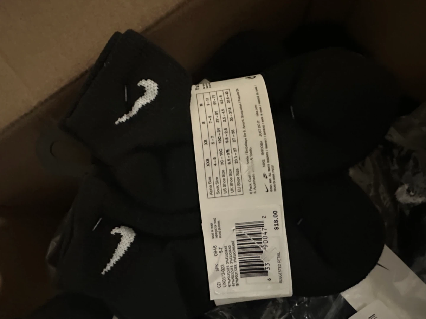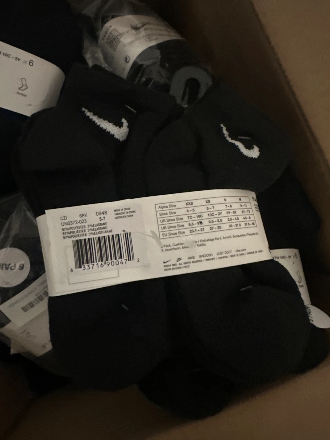 Get your little one ready with these Nike 6-pack cushioned ankle socks! They are black and youth size 10C-3Y. The material is made of 97% polyester and 3% elastane. The original price was $18
