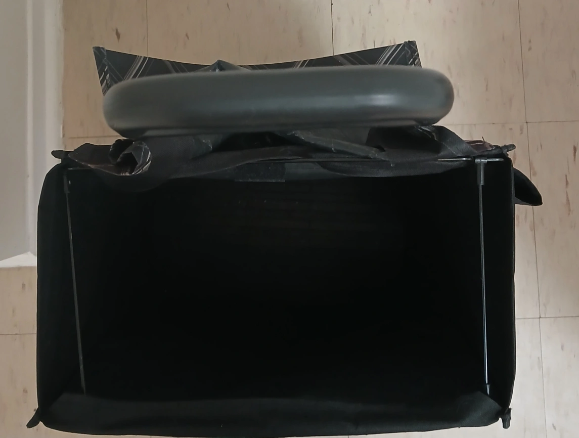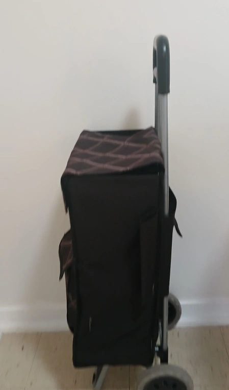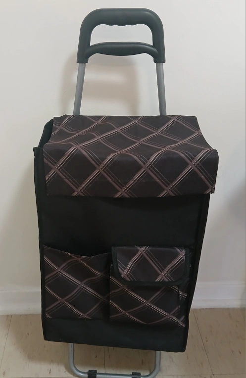 This folding shopping cart is perfect for trips to the grocery store or farmers market! It's black with a patterned top flap and a sturdy frame. It also has some handy pockets on the side for extra storage that includes a umbrella holder ( short/ long slender ones )