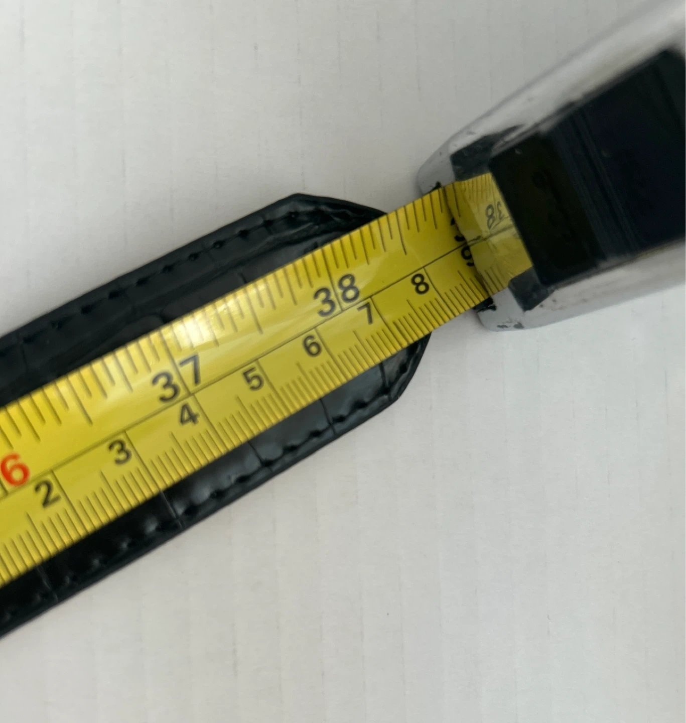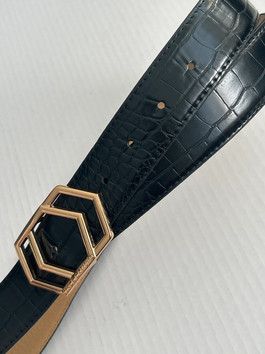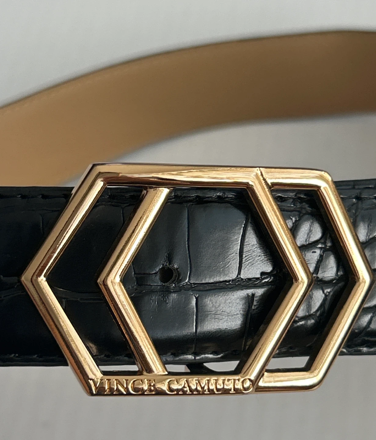 Selling a Vince Camuto belt in black with a croc-embossed pattern. The buckle has a unique geometric design in gold. It's in great condition and ready for a new home! It has a 3.5cm. thickness on the belt.