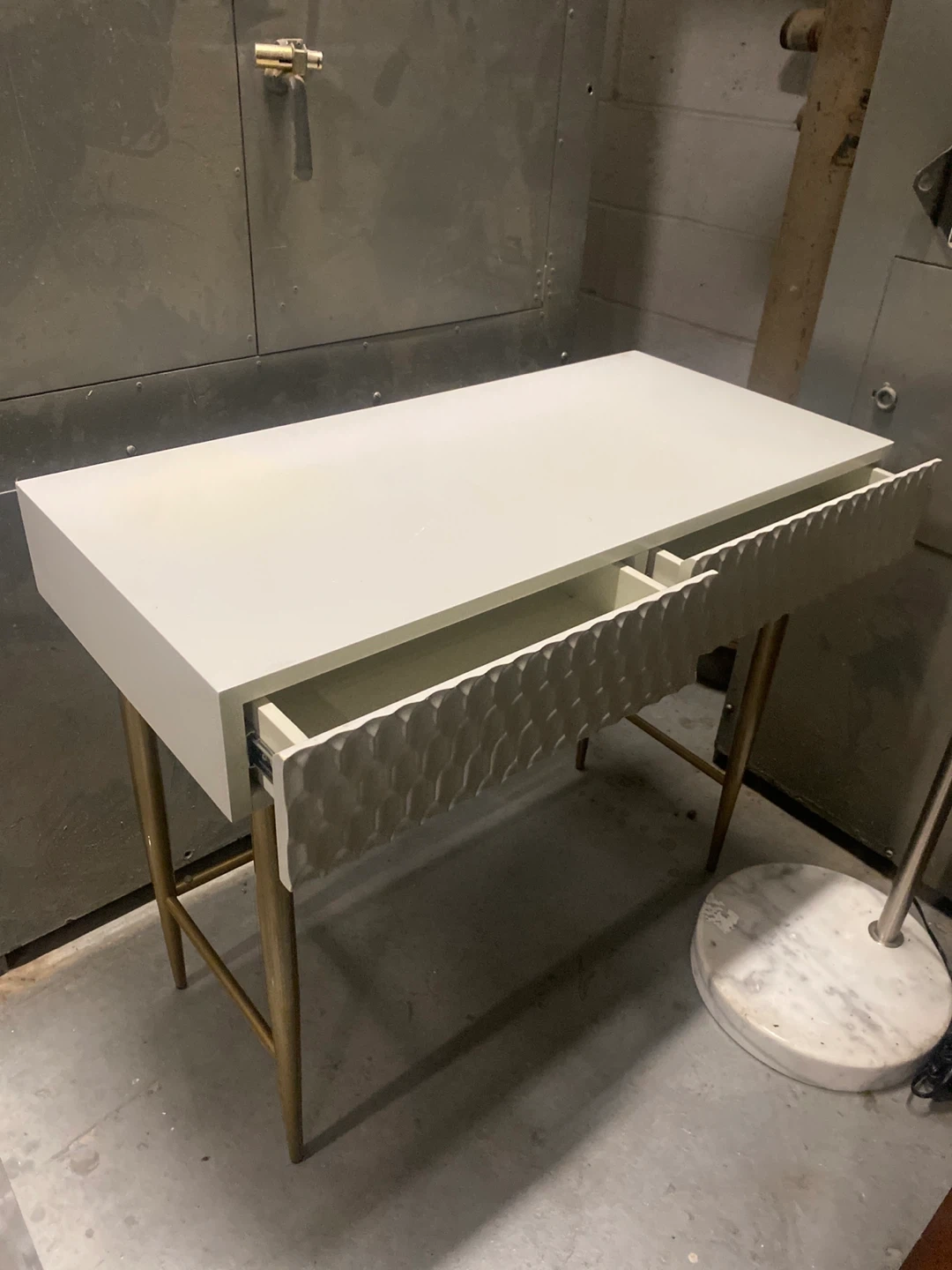 Selling a stylish desk with a white top and gold legs. It features drawers with a unique textured front. It's in great shape and would be a nice addition to any room