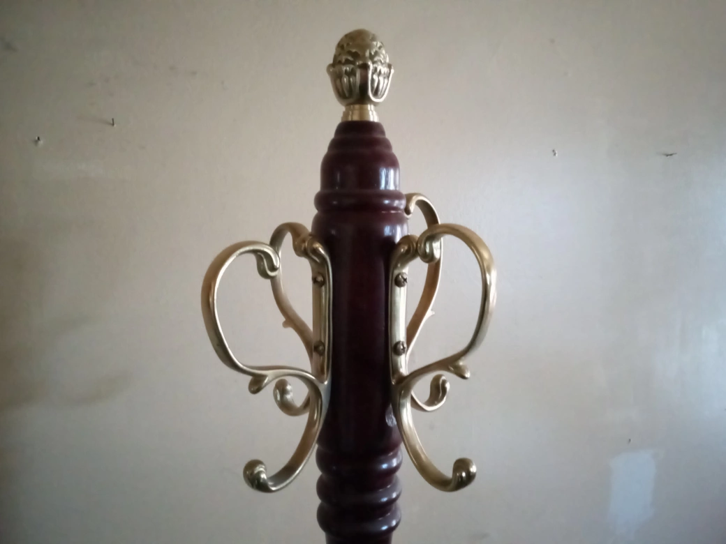 Here's a vintage wooden coat rack stand! It has a classic design with a dark wood finish and brass-coloured hooks. It's perfect for adding a touch of elegance to your entryway or hallway. It's in good condition and ready to hold your coats and hats