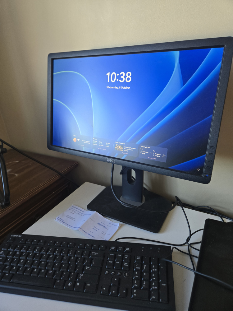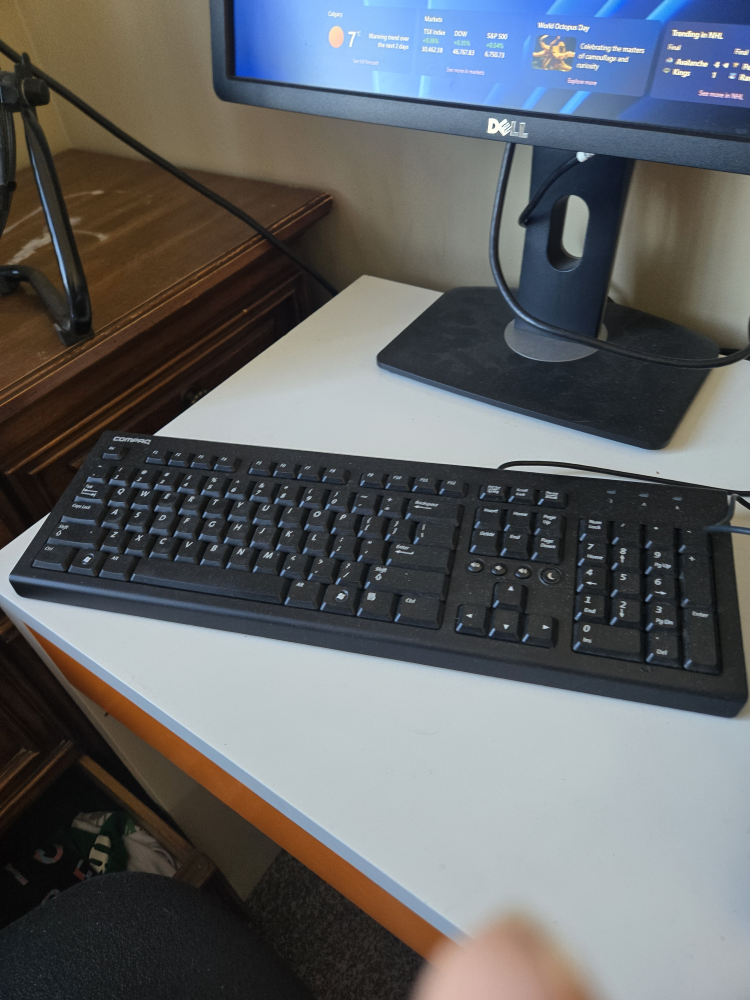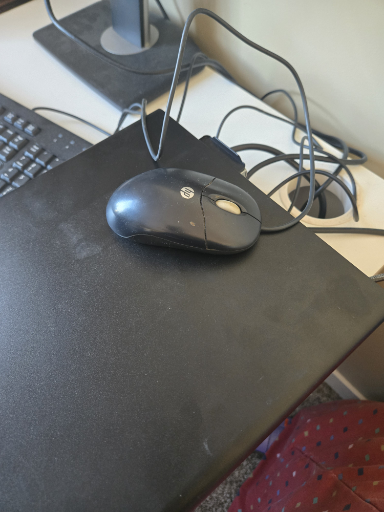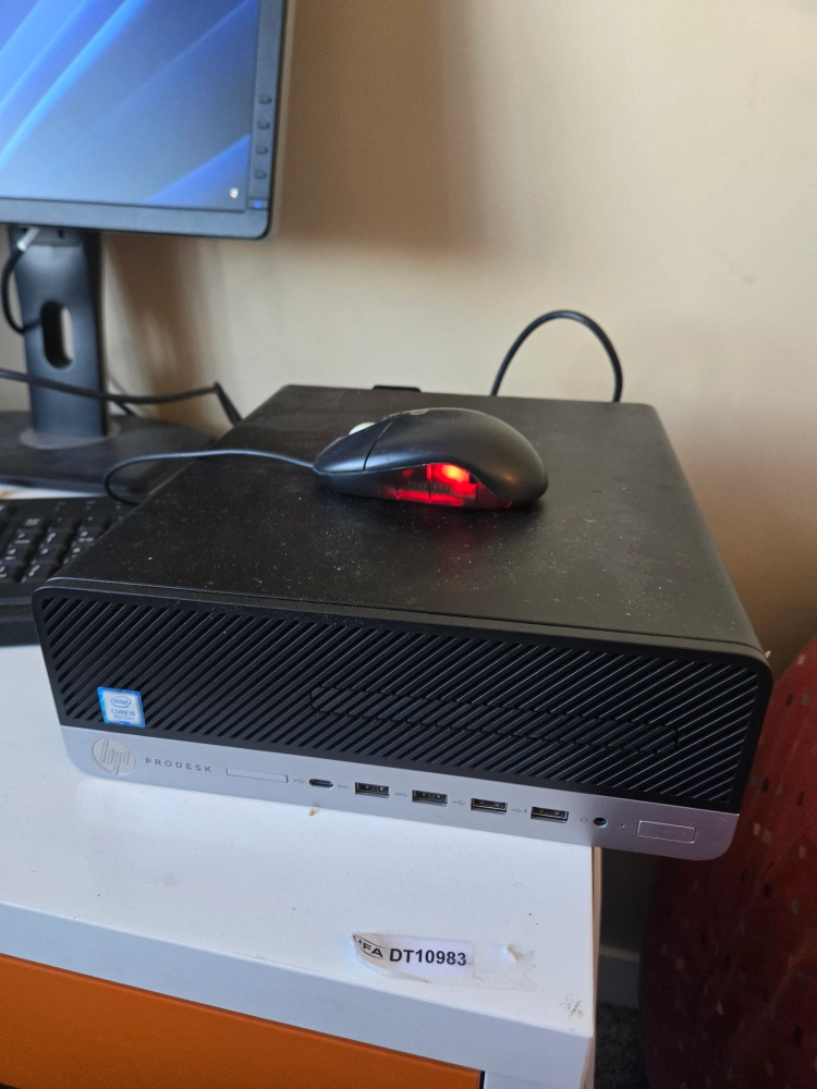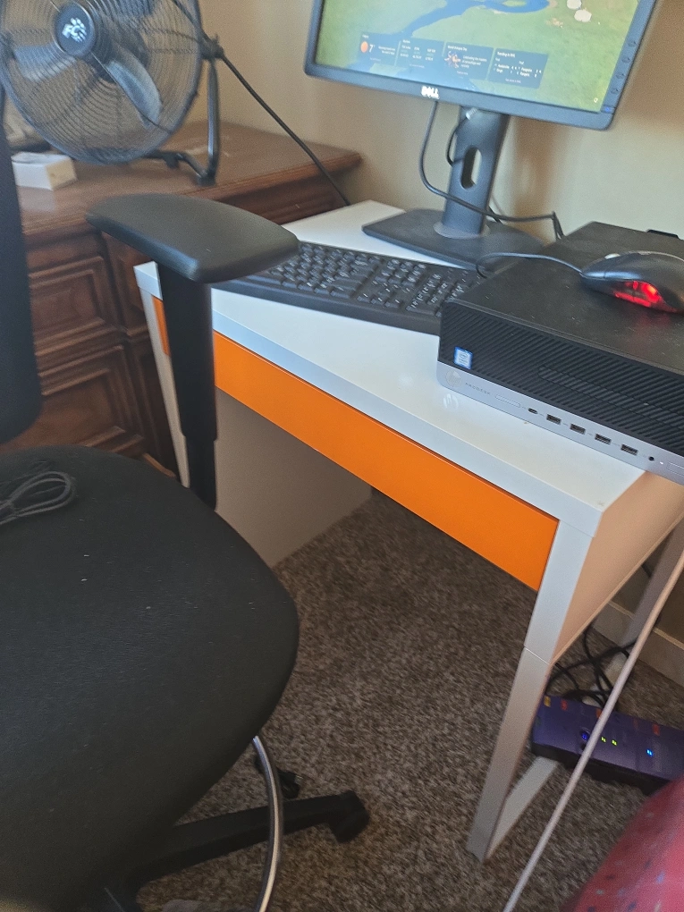 Selling a used office chair and desk. The desk has a white top with an orange drawer. The chair is black and has a mesh back With Hp Prodesk computer and it has been refurbished to a windows and it works good and everything but I don't use that much cash only please no e transfer need gone ASAP