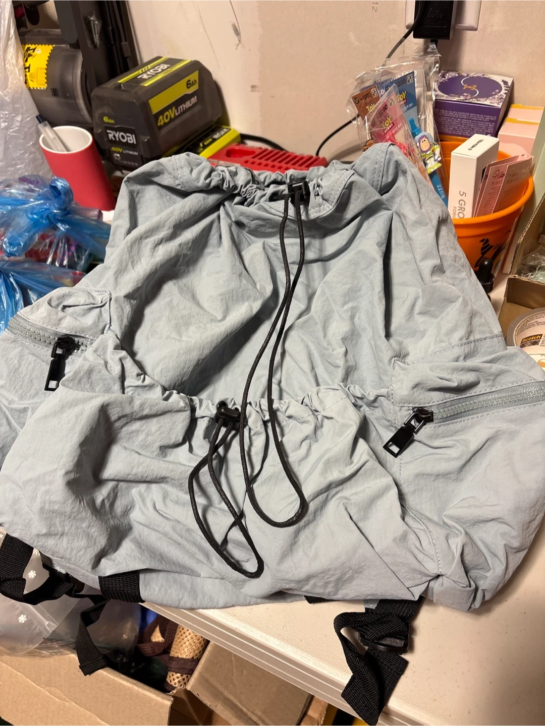 It features a drawstring closure and zippered pockets. The straps are black. It's in great condition