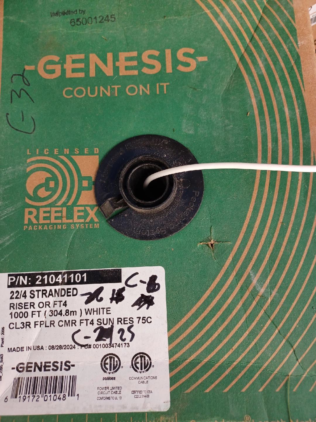 Selling a Genesis 22/4 stranded riser or FT4 cable. It's 160 ft ) of white CL3R FPLR CMR FT4 SUN RES 75C cable. It was made in the USA on August 28, 2024.