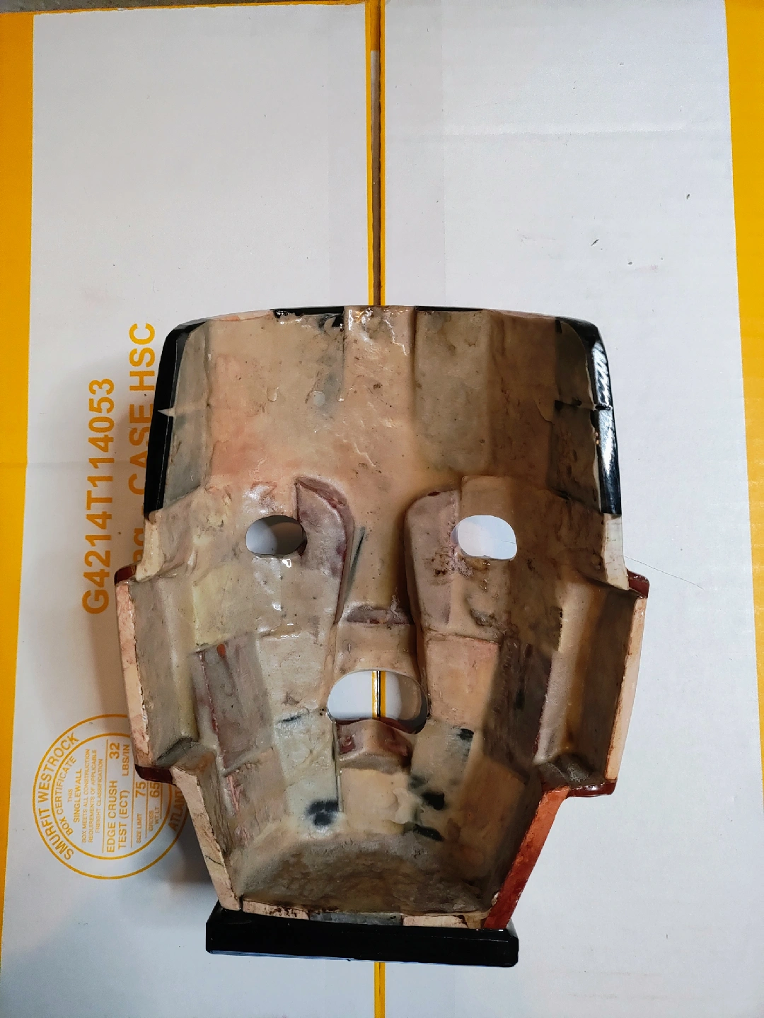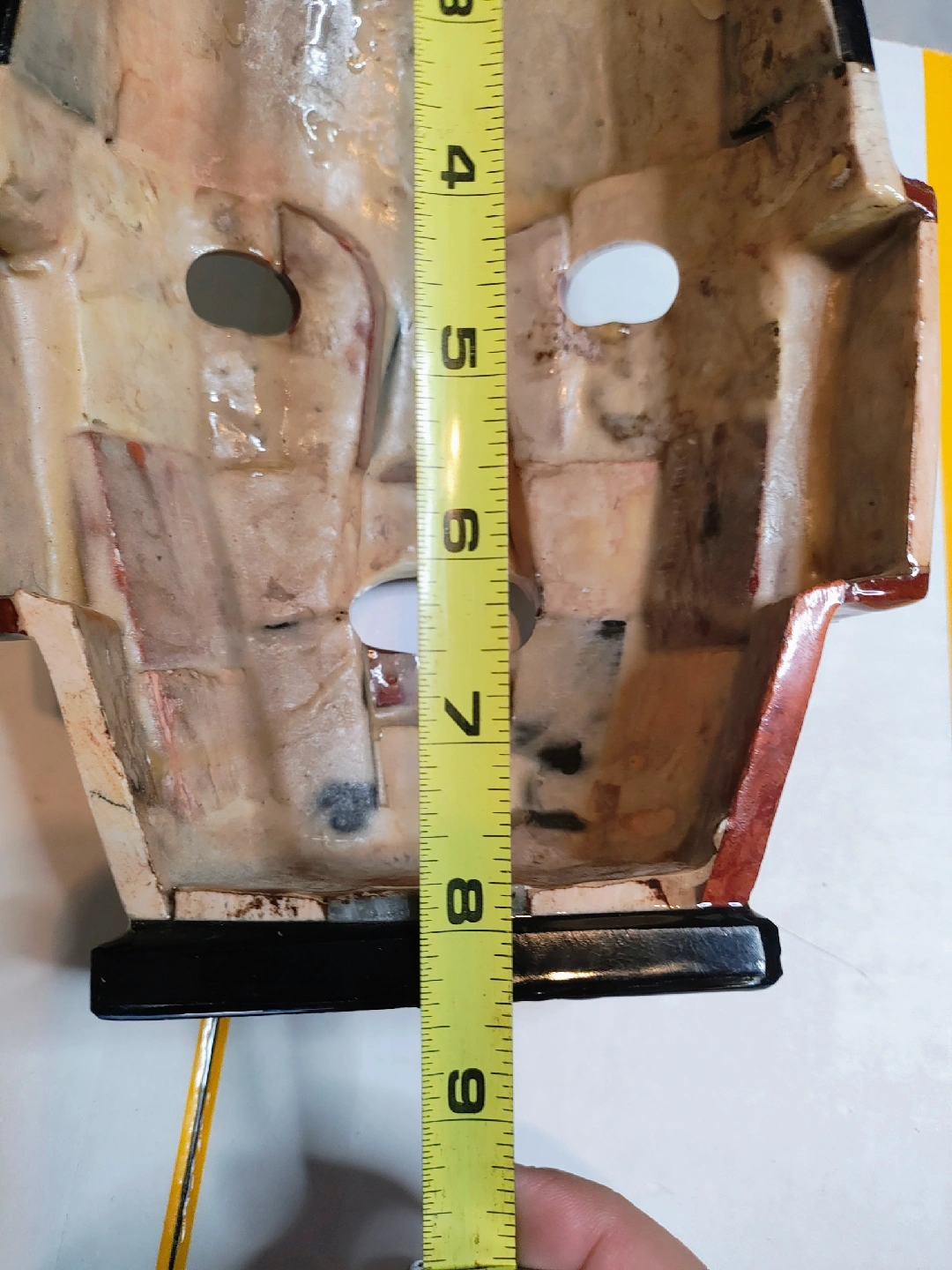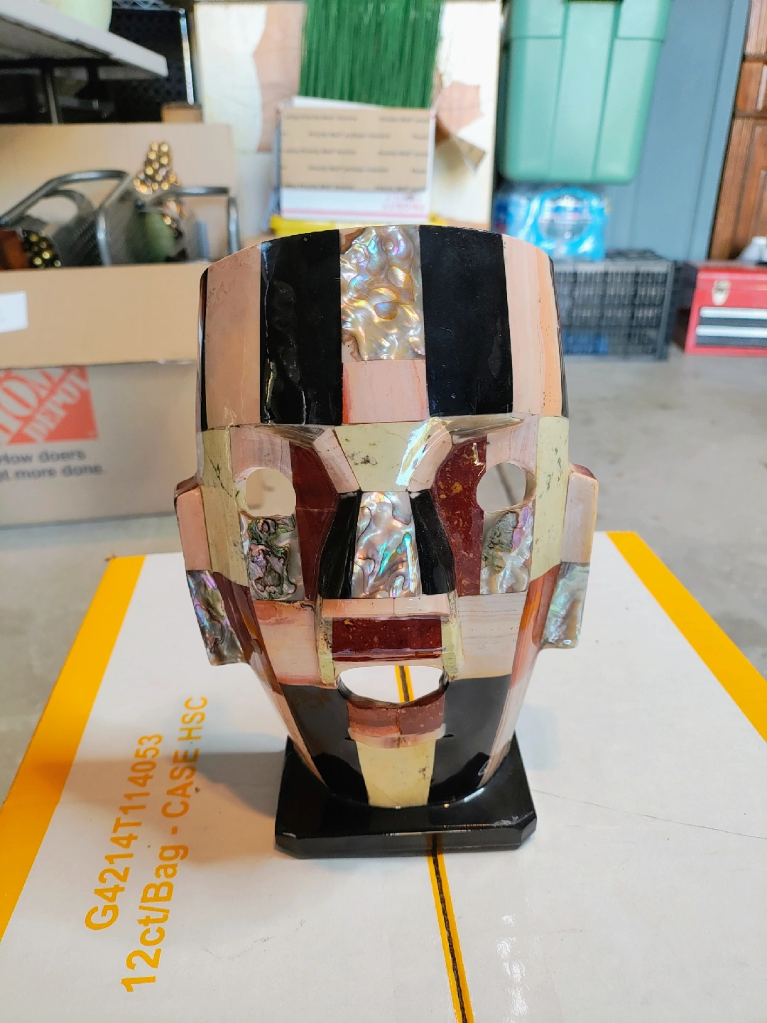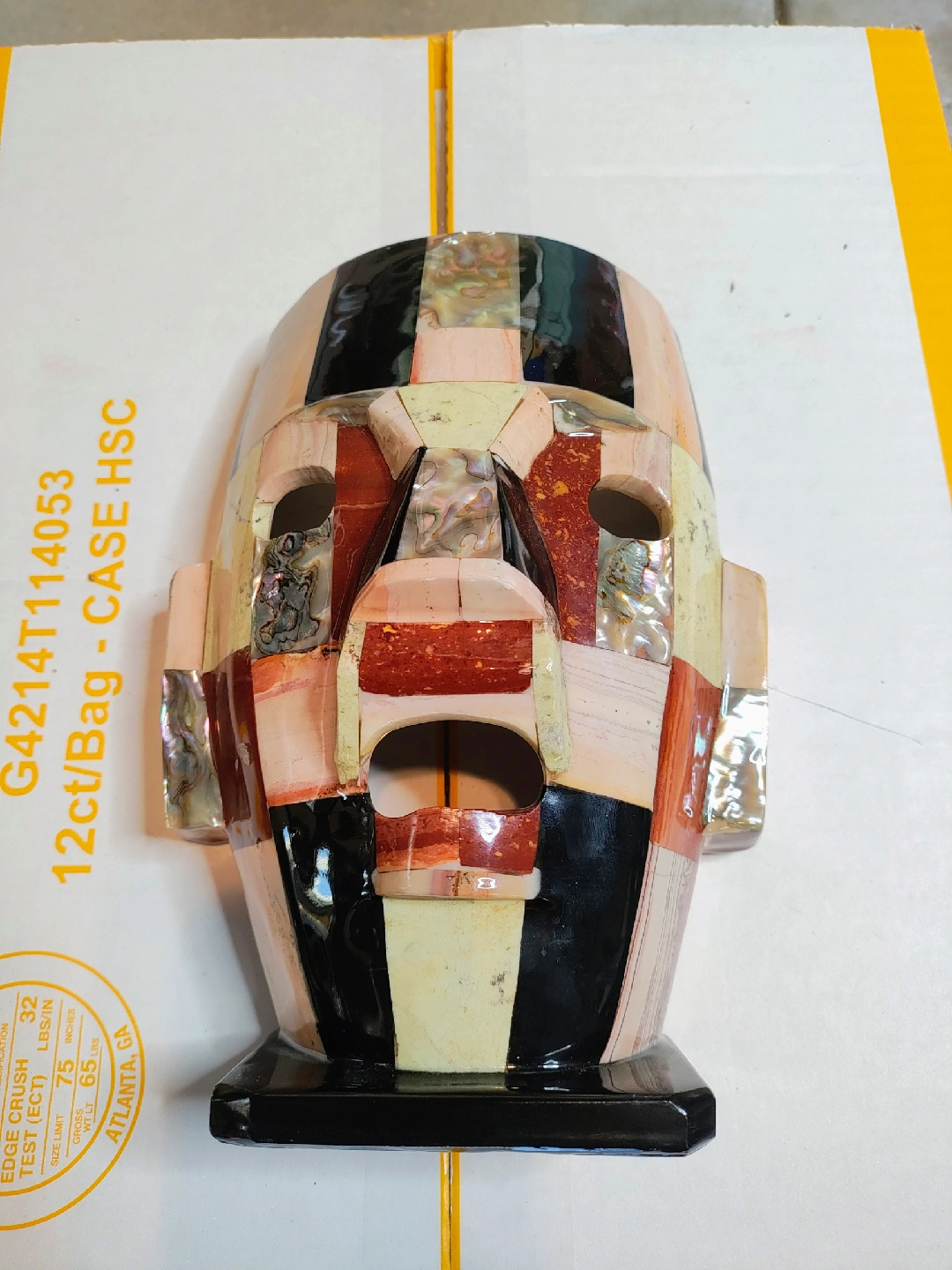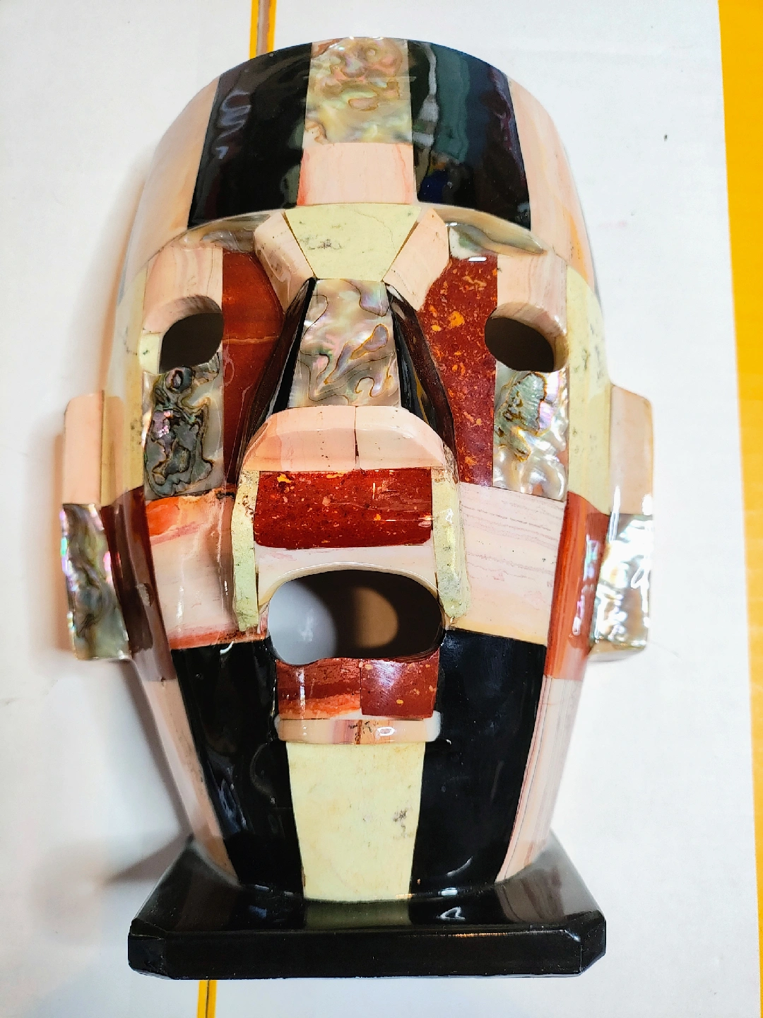 I'm selling a unique stone mosaic mask. It measures approximately 8.5 inches tall. The mask features different colored stones and shell pieces in a mosaic pattern. It's a cool decorative item!