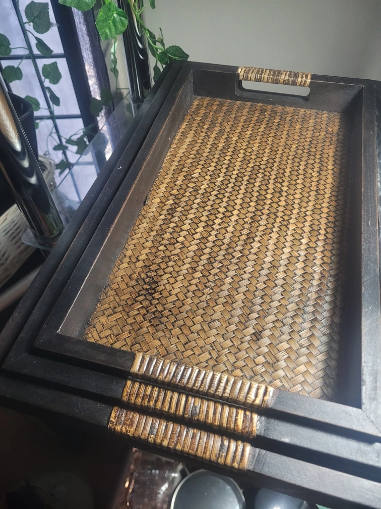 Selling a set of 3 wicker serving trays! Made in Thailand. They feature a dark brown wooden frame and woven wicker bottoms. They have handles for easy carrying, perfect for serving snacks or drinks.