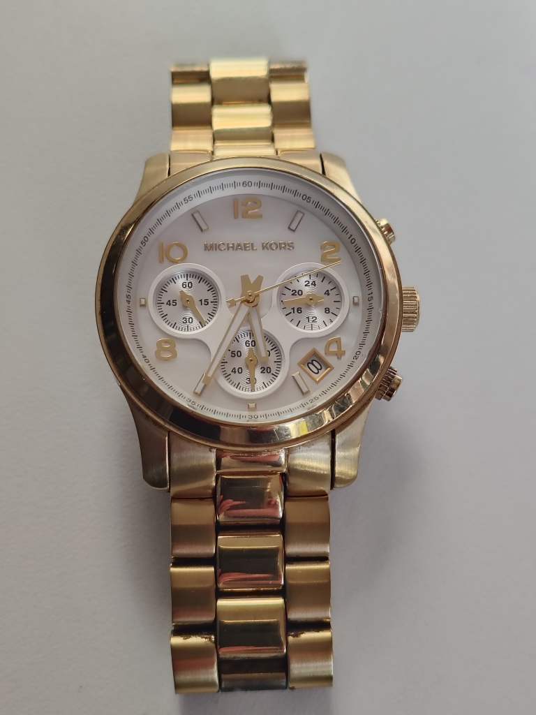 Of all MKs oversize watches - I think this one is the nicest. It's a timeless classic. I have worn it just a few times. There are some light scratches that may or may not be visible to the eye. I put a fresh battery in it: 10/08/25. The cost was $25.00 + hst. Please factor that into the very fair price I am asking. It's in great working order. Happy to send a video to show.