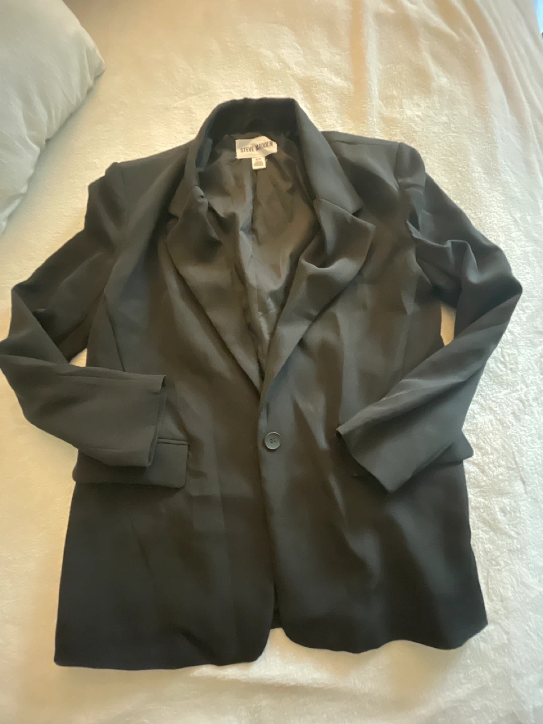 Selling a Steve Madden black blazer in size small. It's a classic piece that can be dressed up or down. Great for work or a night out! With shoulder pads for more structure.