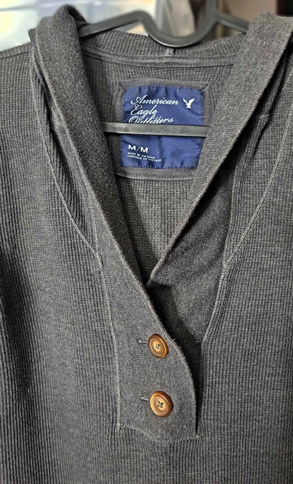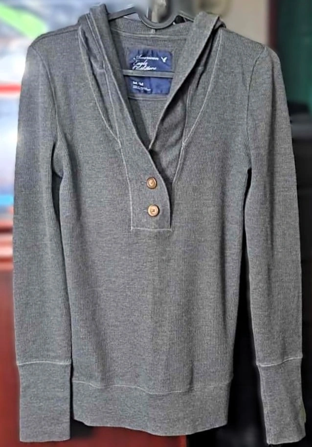 Here's a comfy American Eagle Outfitters hoodie in size M! It's a stylish grey colour with a button-up front and a hood. Perfect for layering or wearing on its own.❤️