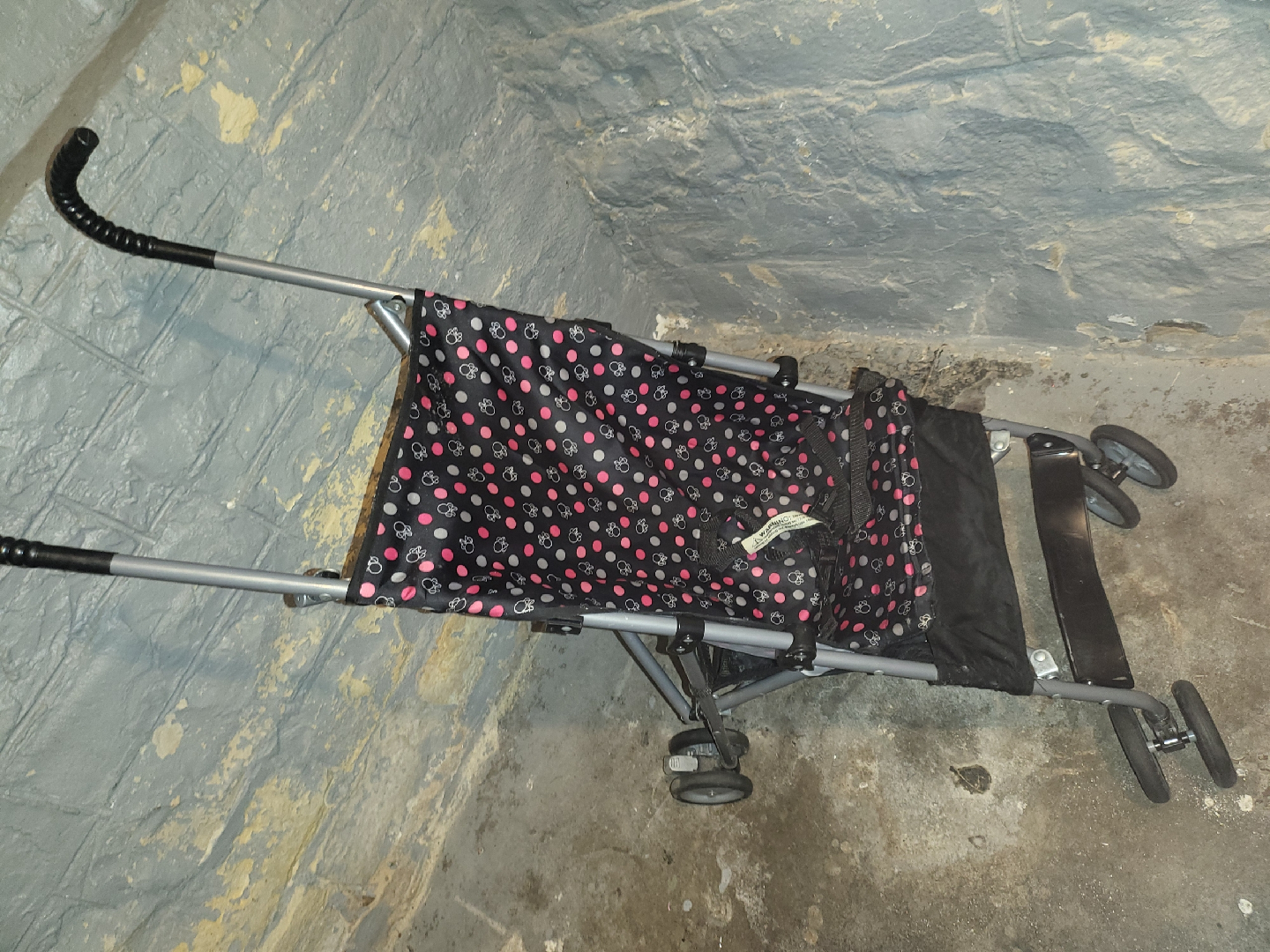 Selling a gently used umbrella stroller! It has a cute pink and black polka dot design. Perfect for quick trips and travel because it's lightweight and easy to fold up. The stroller is in good condition and ready for a new little rider