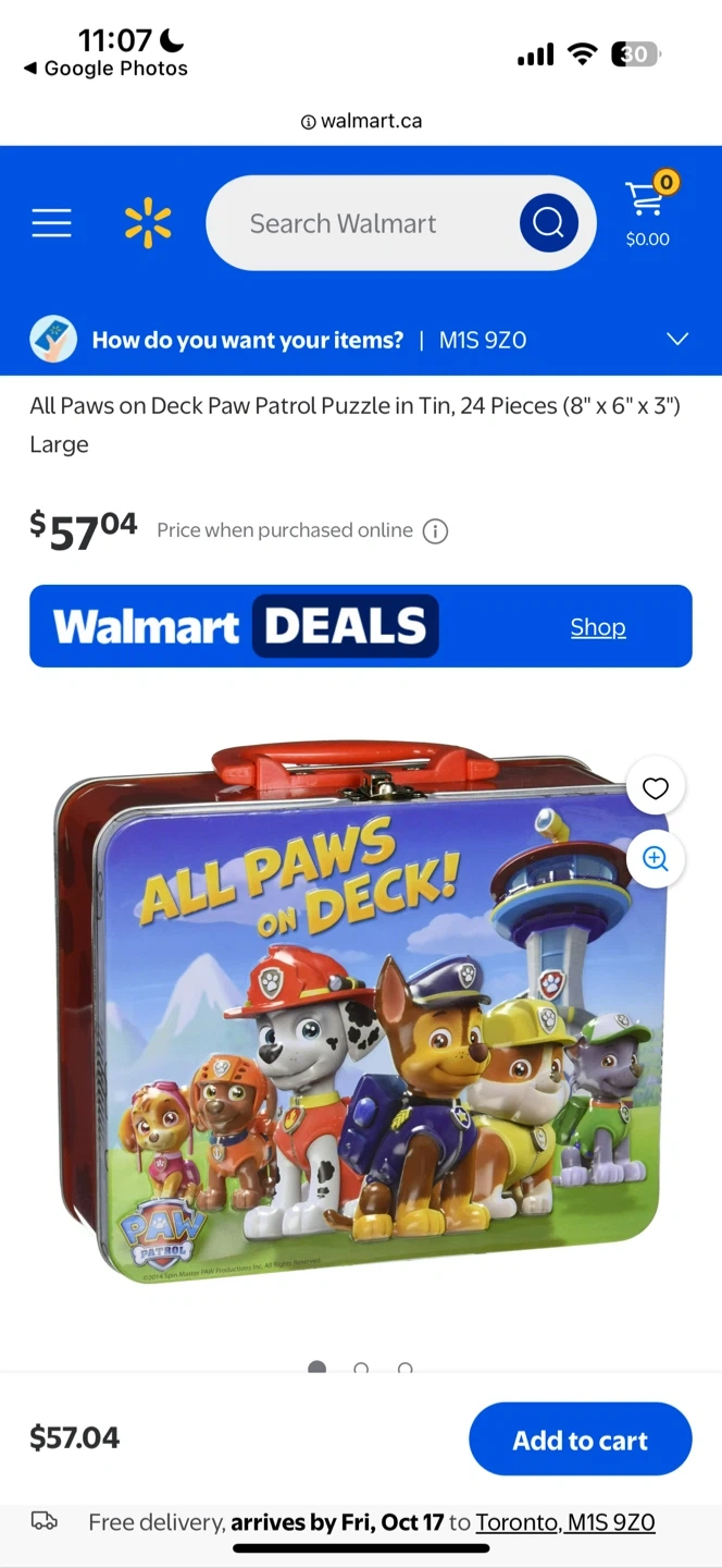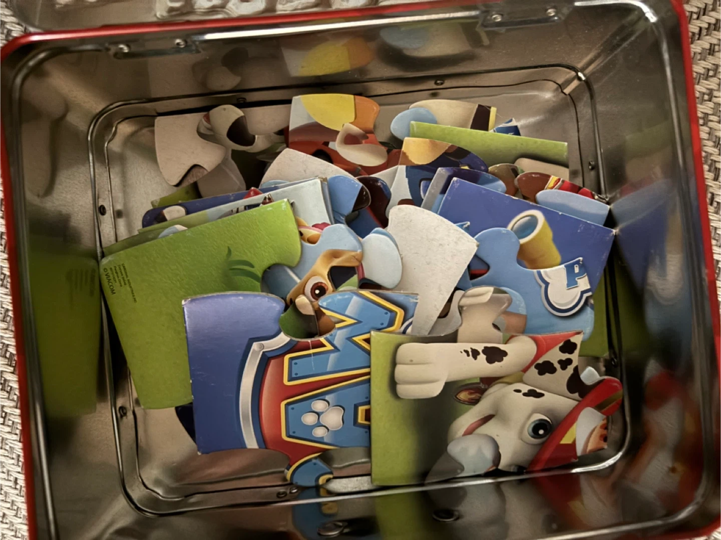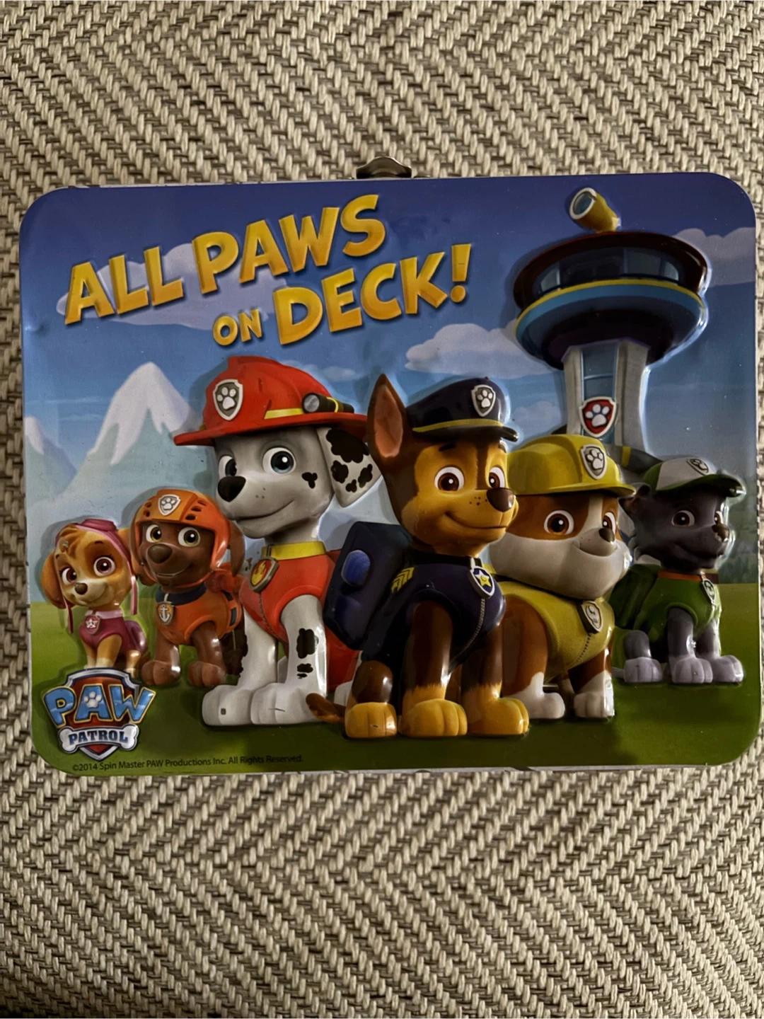 Selling a Paw Patrol puzzle that comes in a cute tin! It's the 'All Paws on Deck' version with 24 pieces. The tin measures approximately 8" x 6" x 3". Originally bought for $57.04 at Walmart