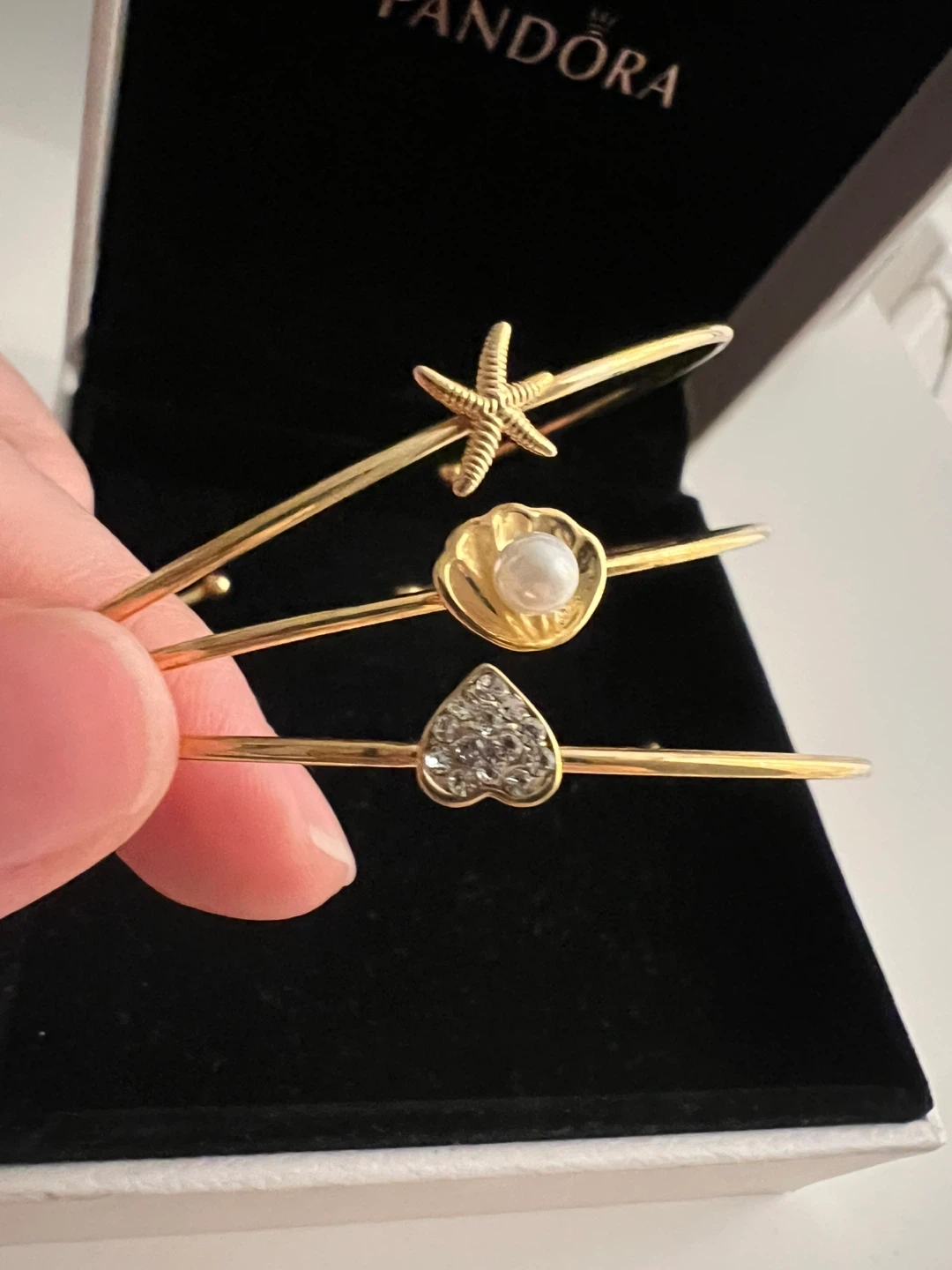 Selling a beautiful bangle set. It comes with three separate bangles, each adorned with a unique charm: a starfish, a pearl nestled in a shell, and a sparkling heart. Perfect for adding a touch of elegance to any outfit!