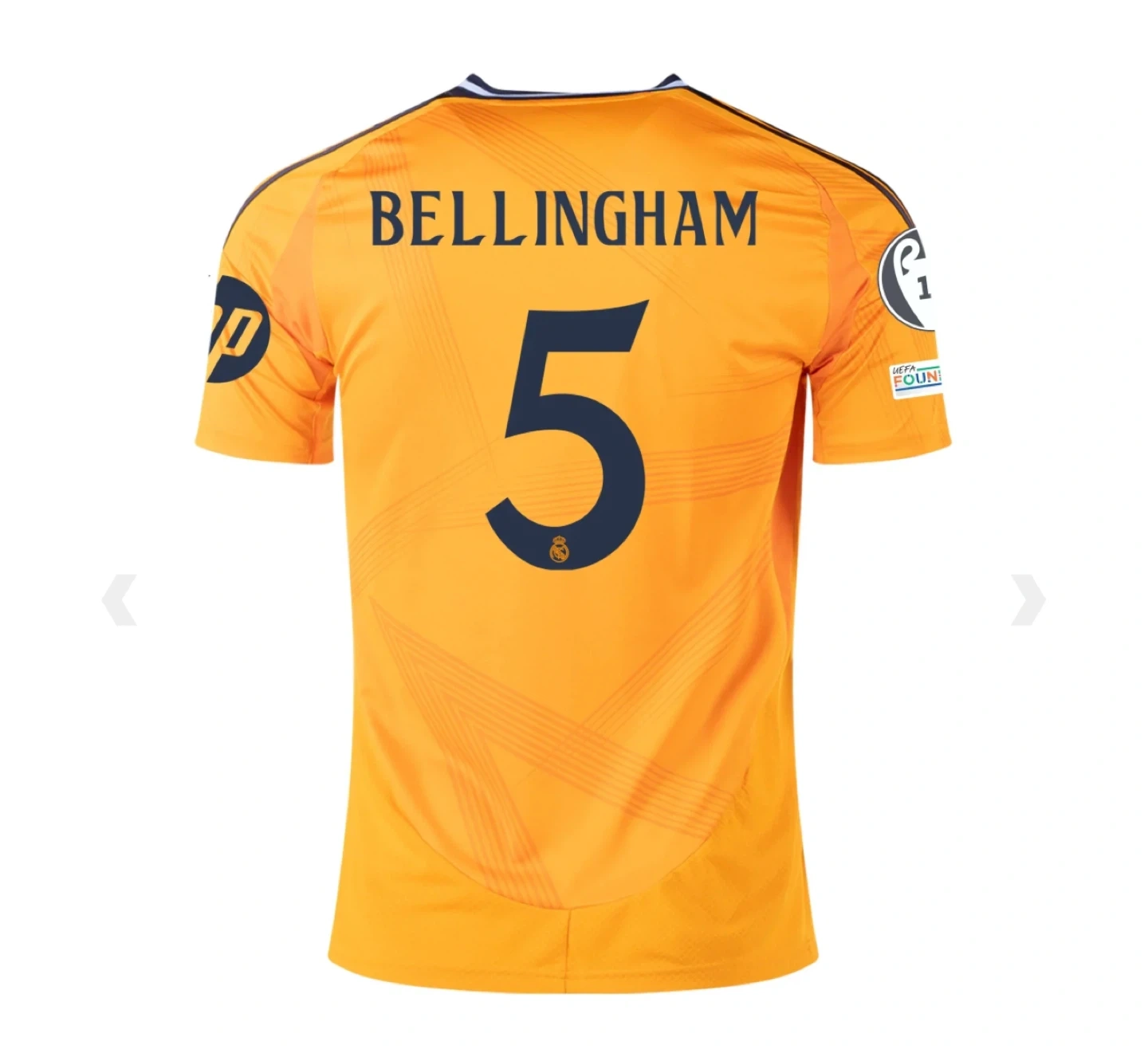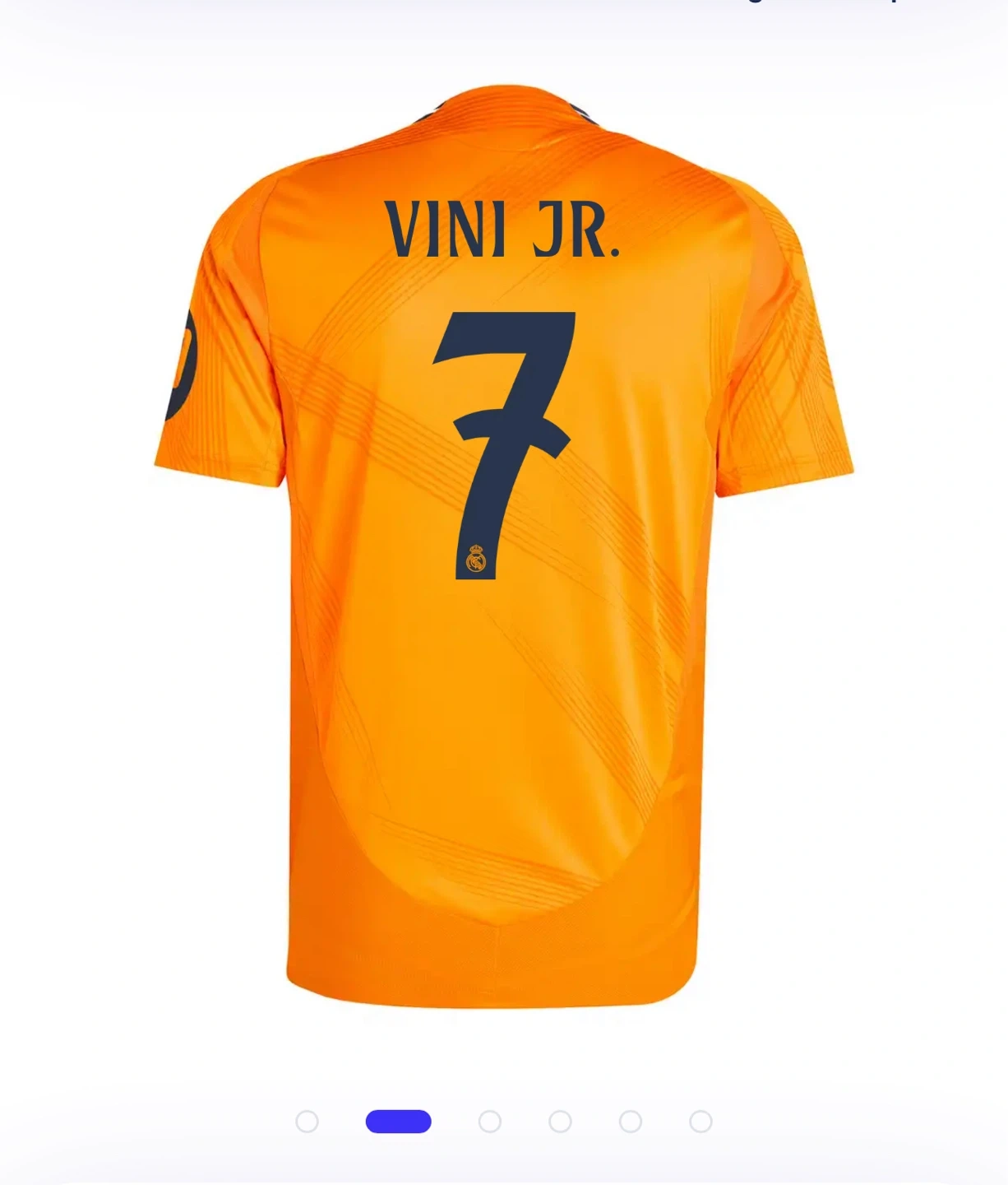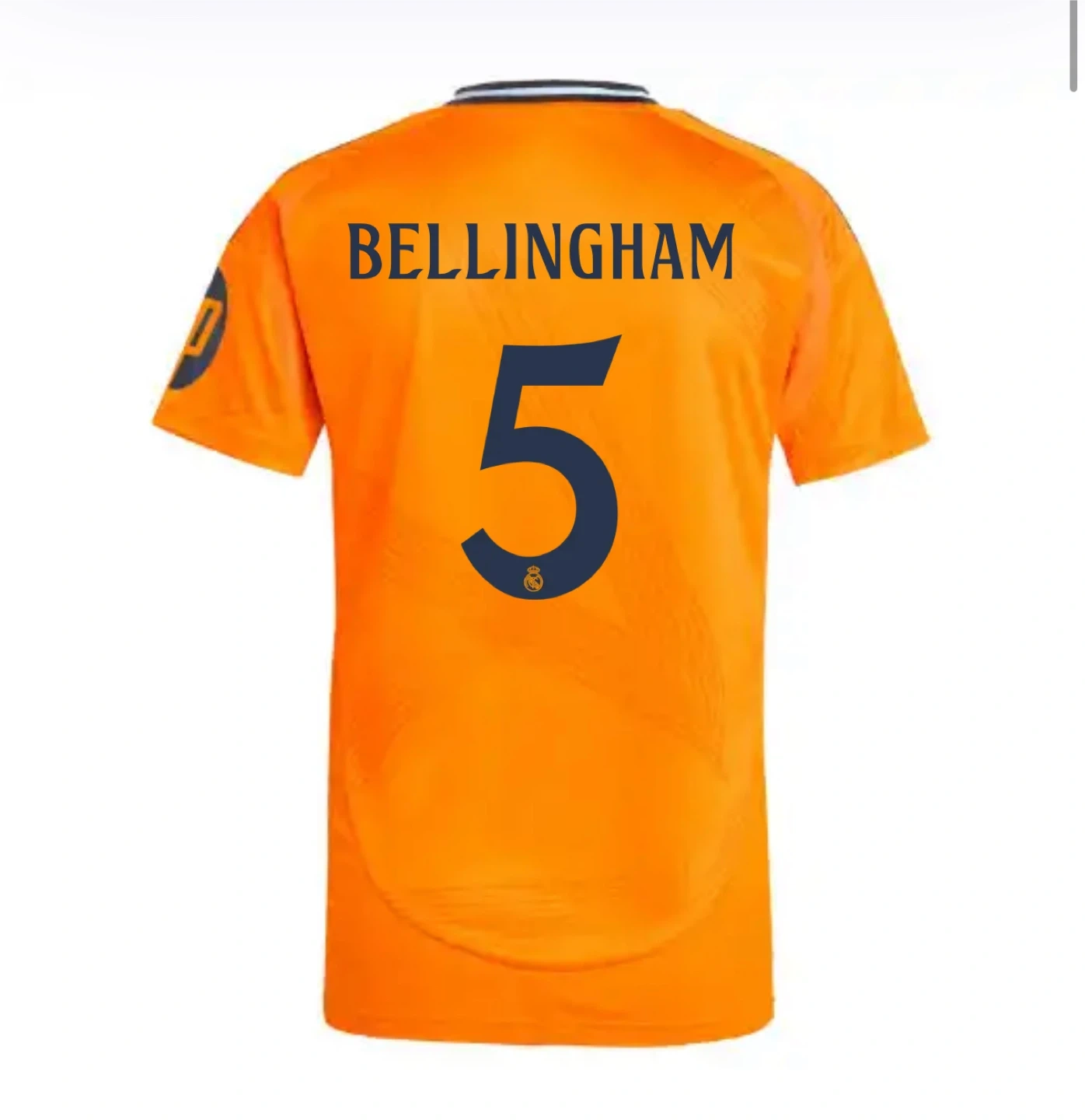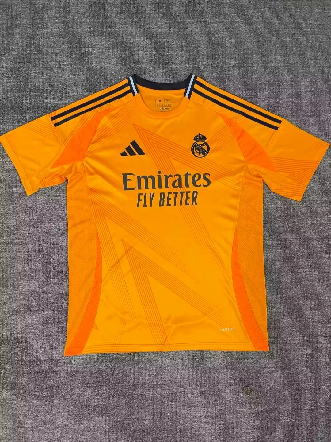 10Selling an Adidas Real Madrid soccer jersey. The jersey is orange and features the Emirates FLY BETTER logo. Available with names like Mbappe, Vini Jr., and Bellingham