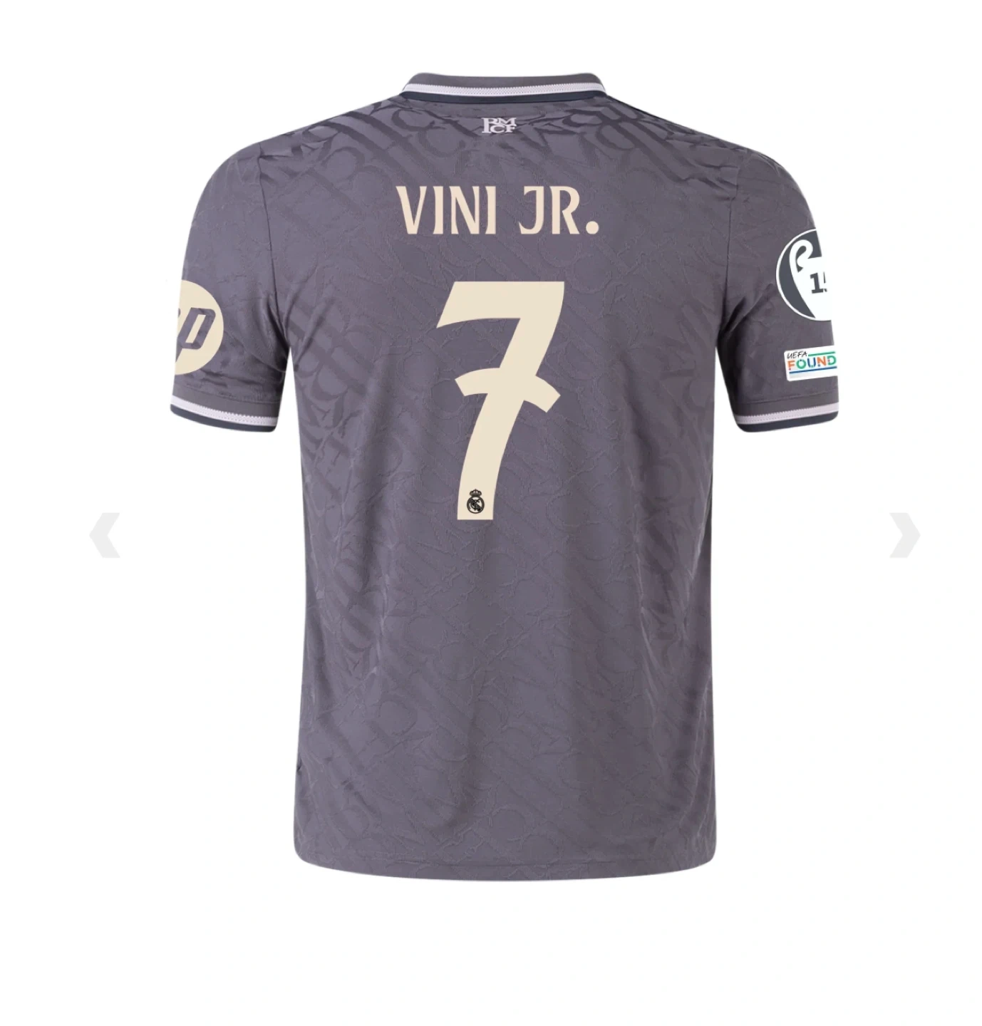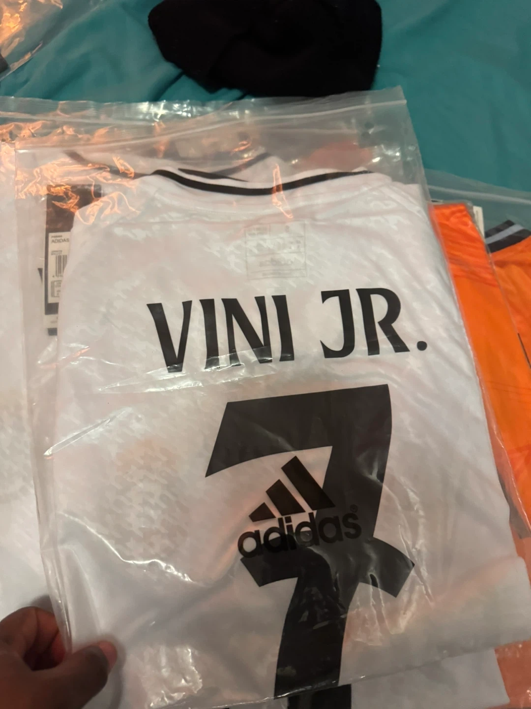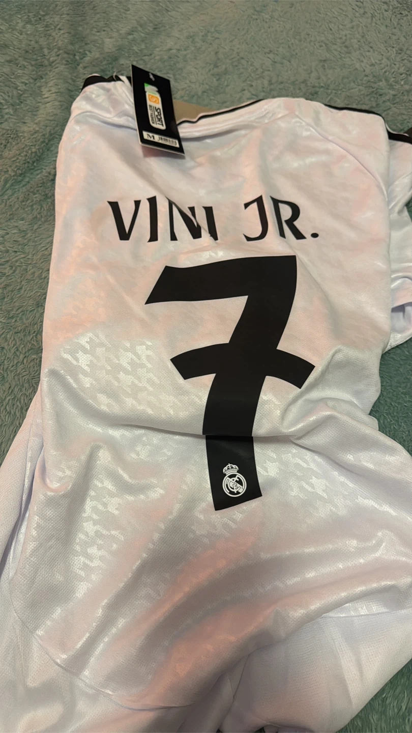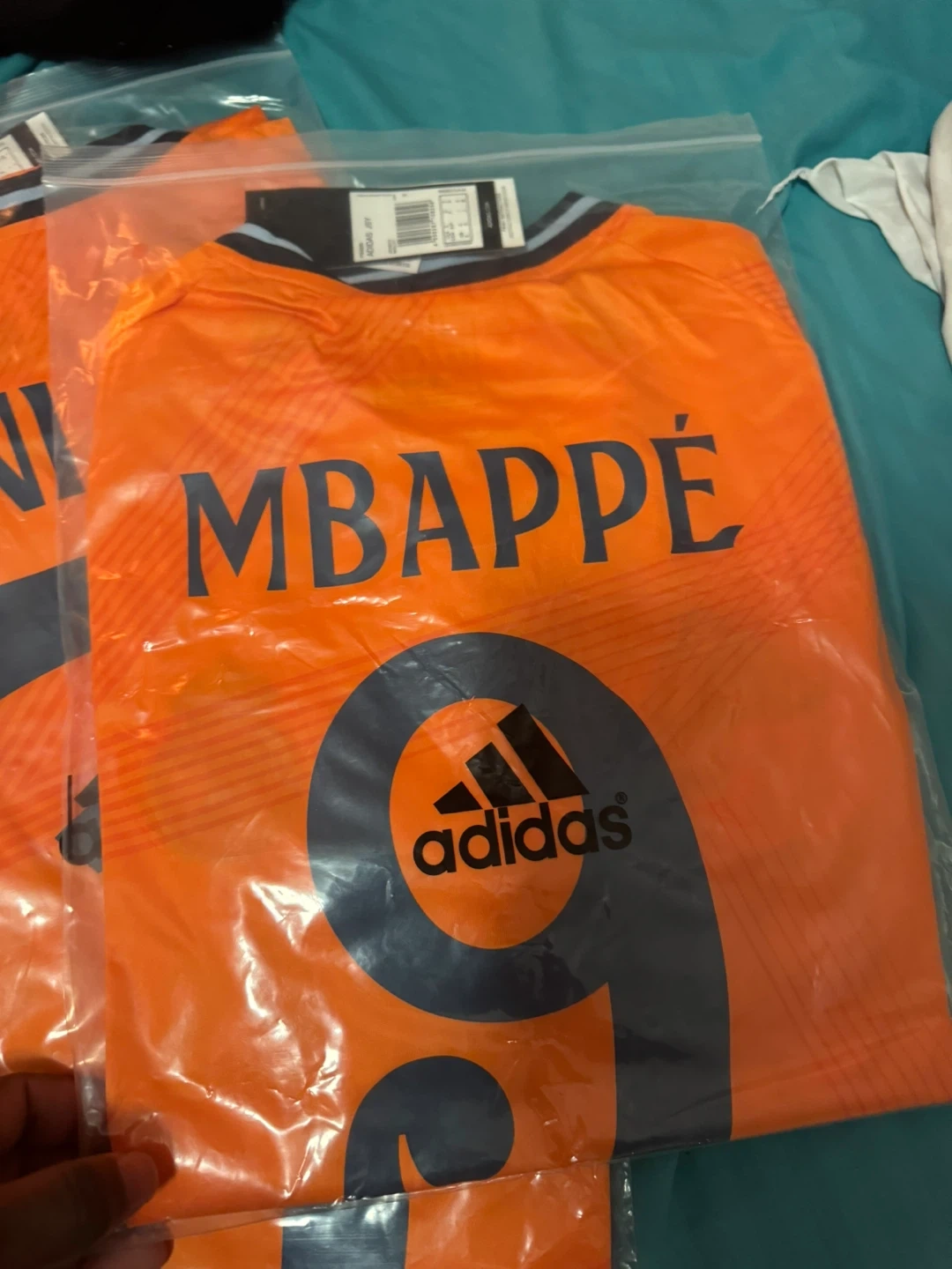 10Selling an Adidas Real Madrid soccer jersey. The jersey is orange and features the Emirates FLY BETTER logo. Available with names like Mbappe, Vini Jr., and Bellingham
