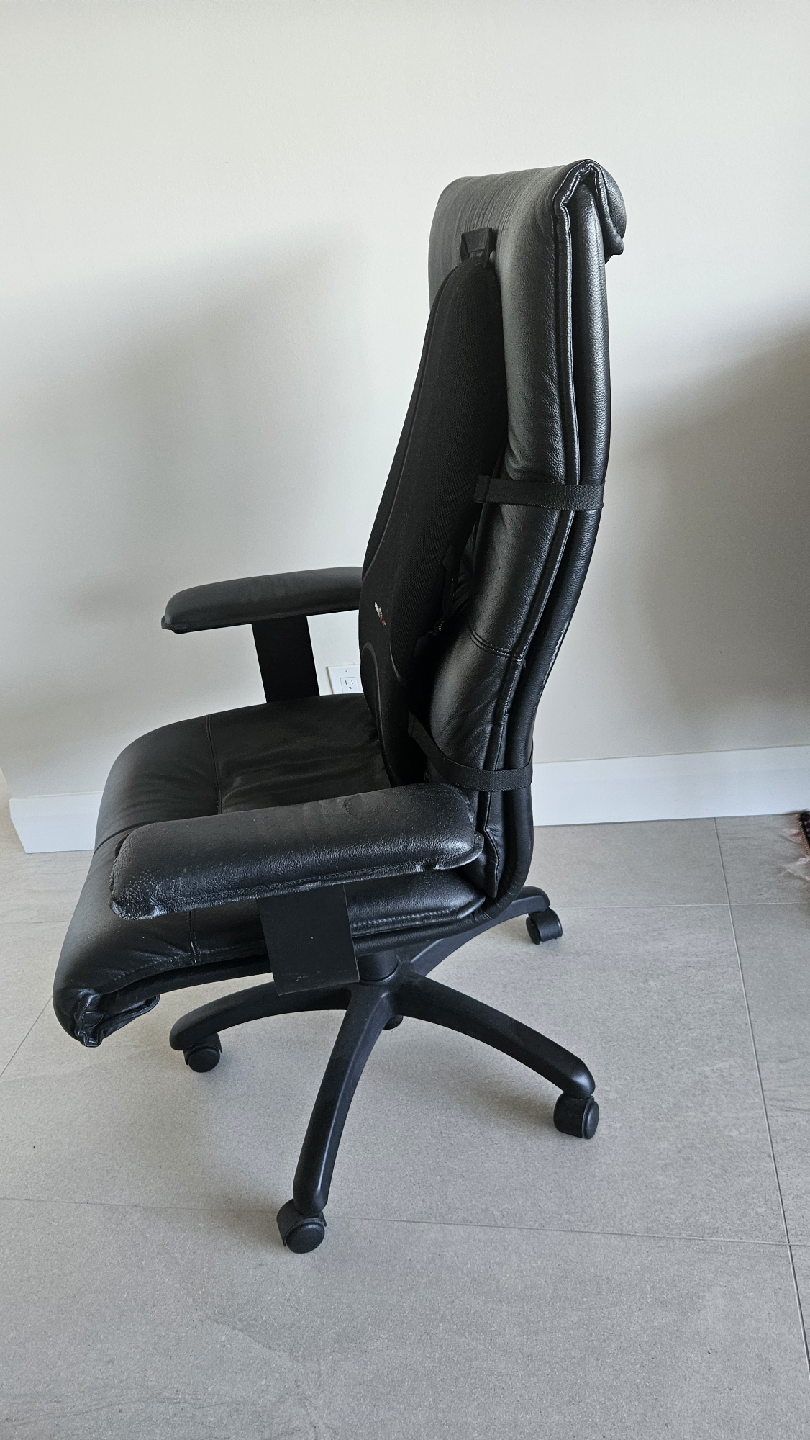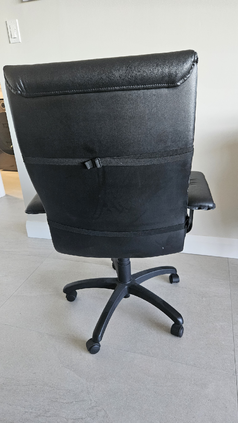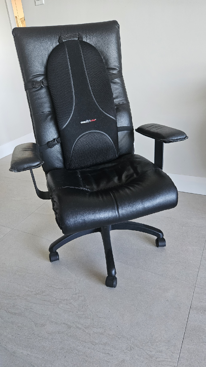 Selling a comfy black office chair! It comes with built-in back support for those long workdays. The chair is in good condition and ready for a new home. Perfect for your home office or study space!