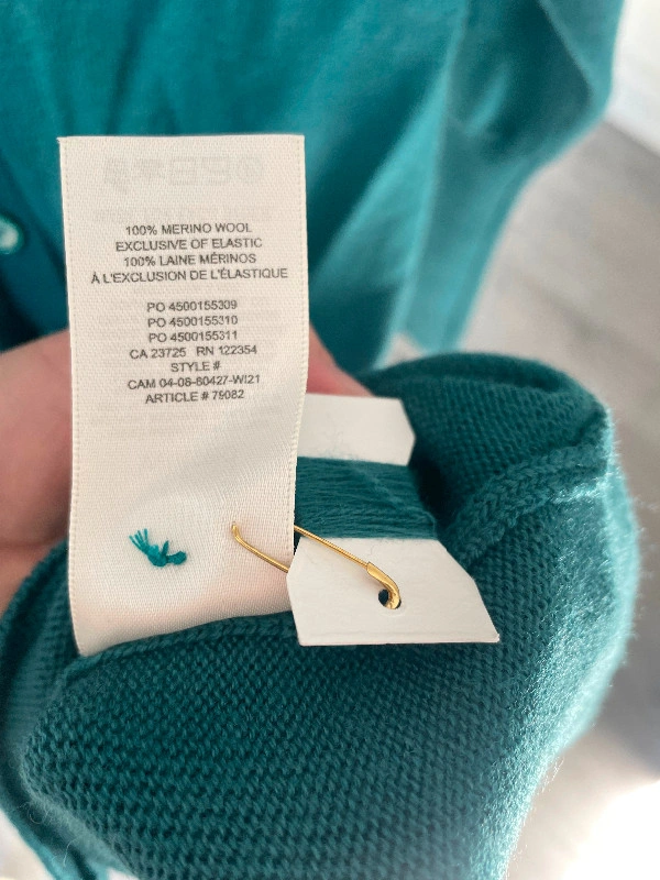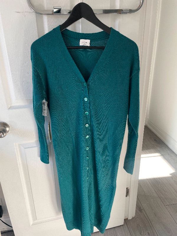 New with tags, never worn, size 2XS Wilfred Aritzia Long Sleeved V-Neck Sweater Dress Knit Line Cardigan originally $178. Ribbed collar, cuffs, and hem. 100% Merino wool fabric from Italy.