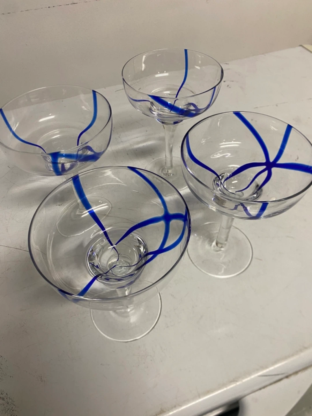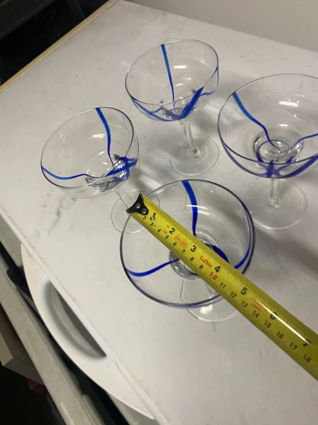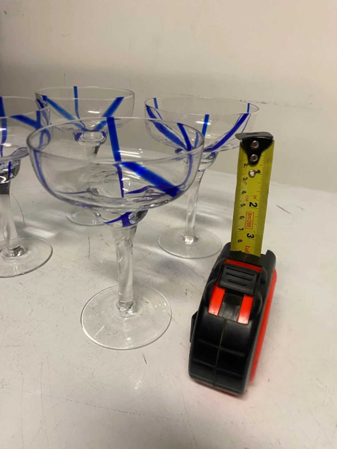 Selling a set of four margarita glasses. They're clear glass with a blue striping design. Each glass measures approximately 4 inches in diameter. Perfect for your next fiesta !