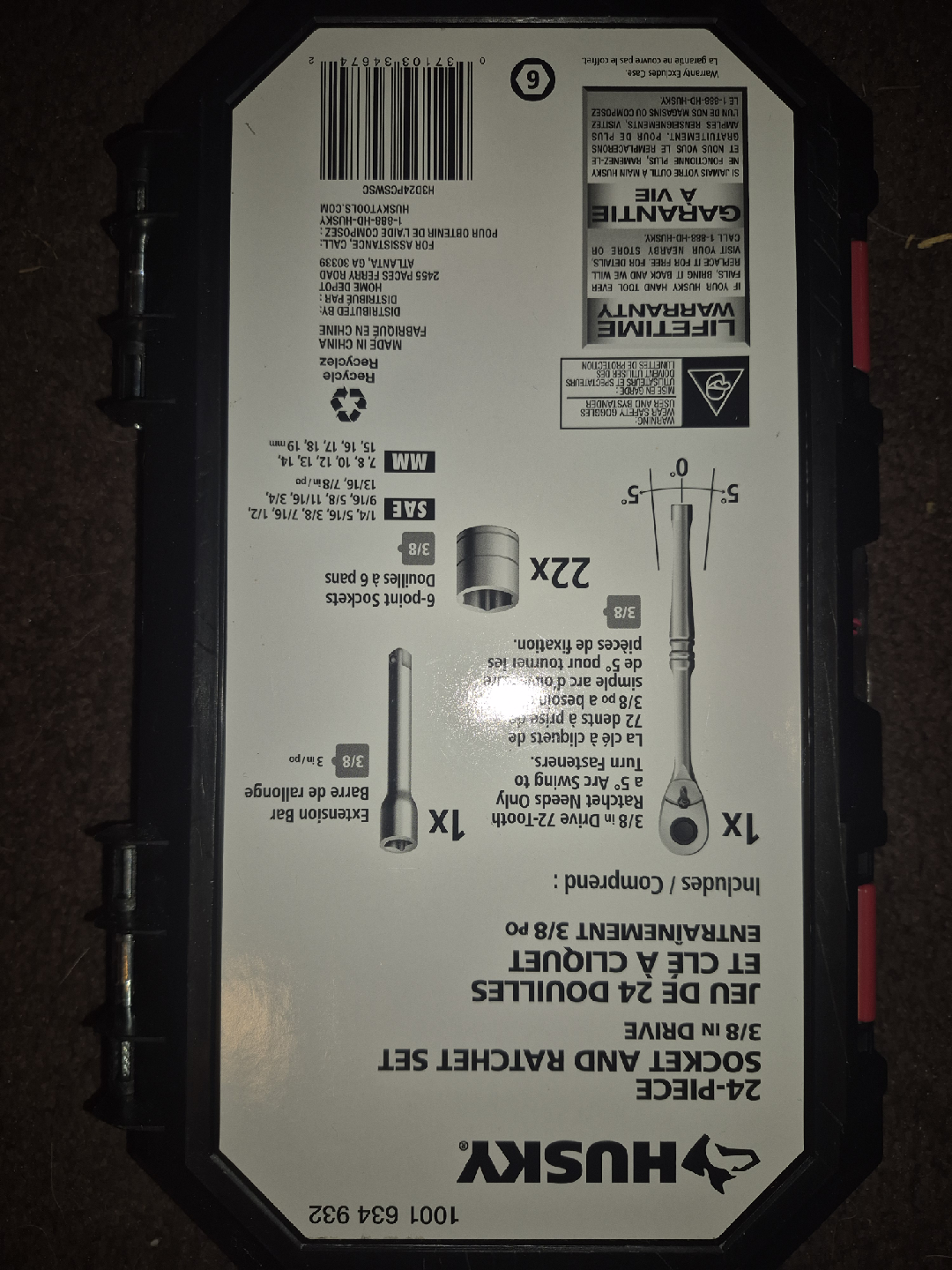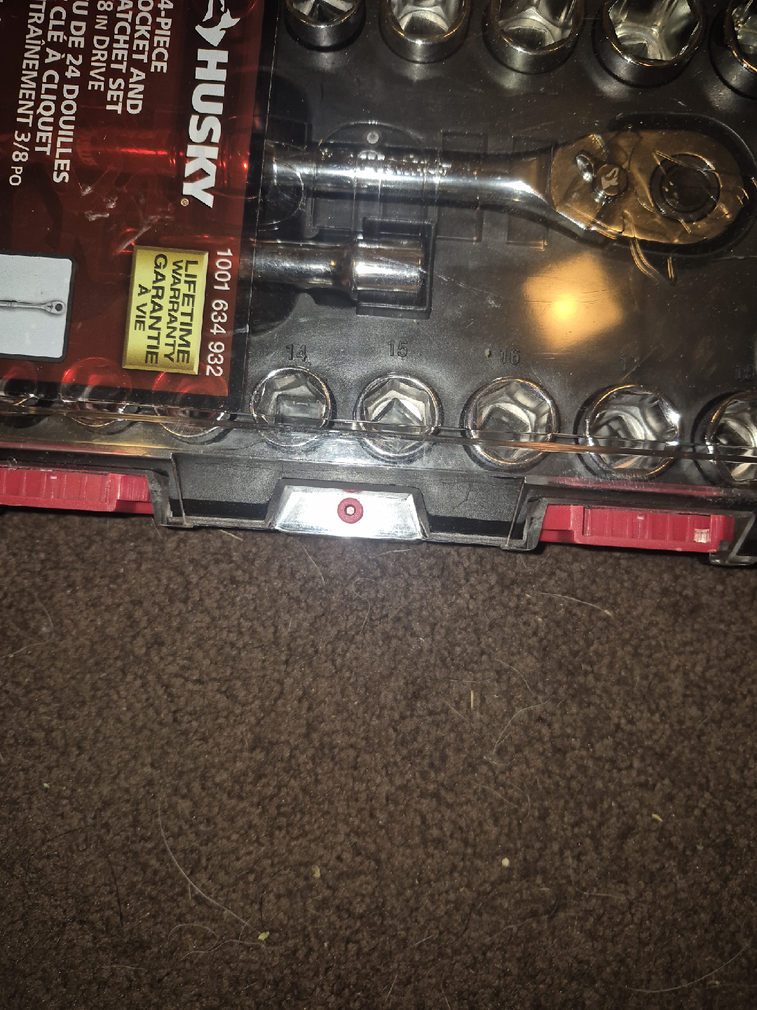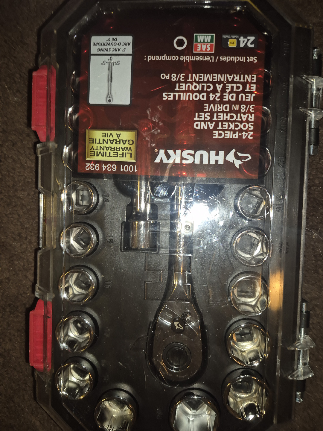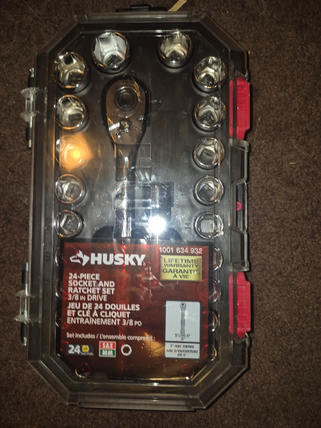 Selling a Husky 24-piece socket and ratchet set. It's a 3/8 inch drive set and includes 22 sockets, an extension bar, and a 72-tooth ratchet. The set comes in its original case for easy organization and storage. and theft pin is still intact so you know its brand new .