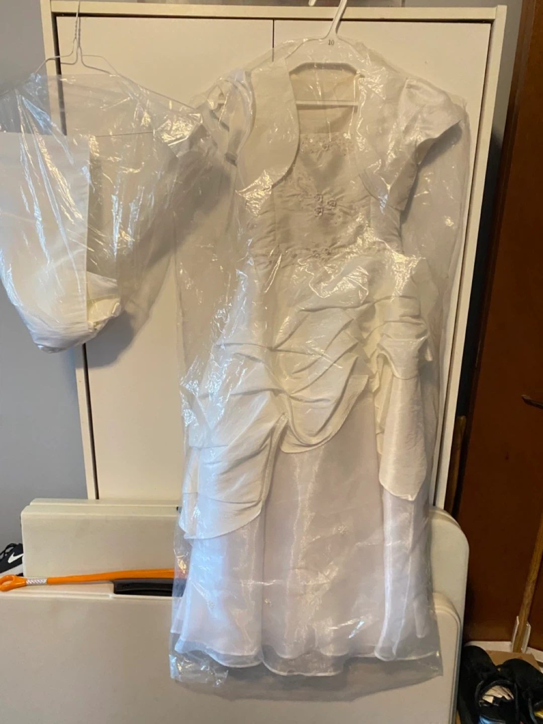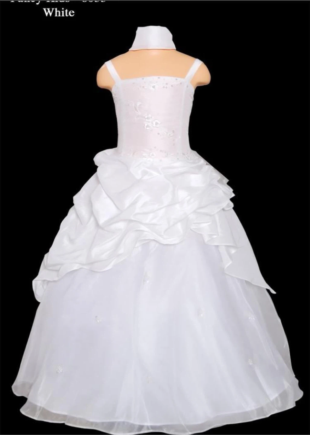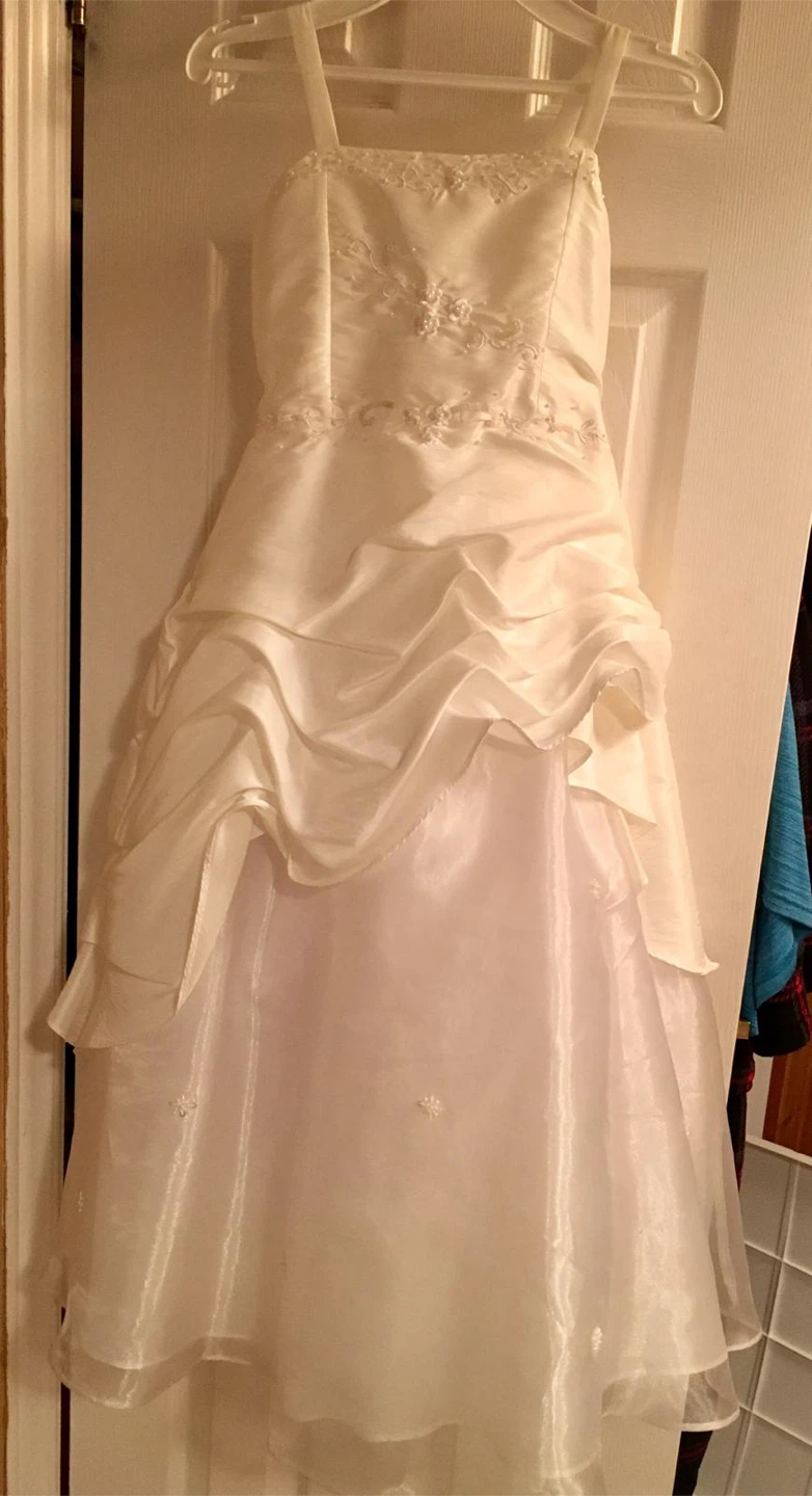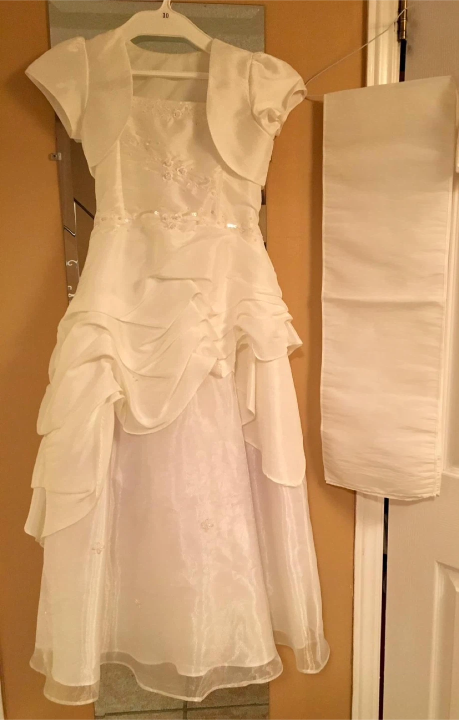 This is a beautiful 3 piece First Communion Dress Size 10 Girls. It comes with a short sleeve jacket and a shawl. Plus included a pair of Size 1 Girls shoes. This outfit and shoes were worn once. Dress and shoes are white in colour with pearl & silver accents. Great used condition.