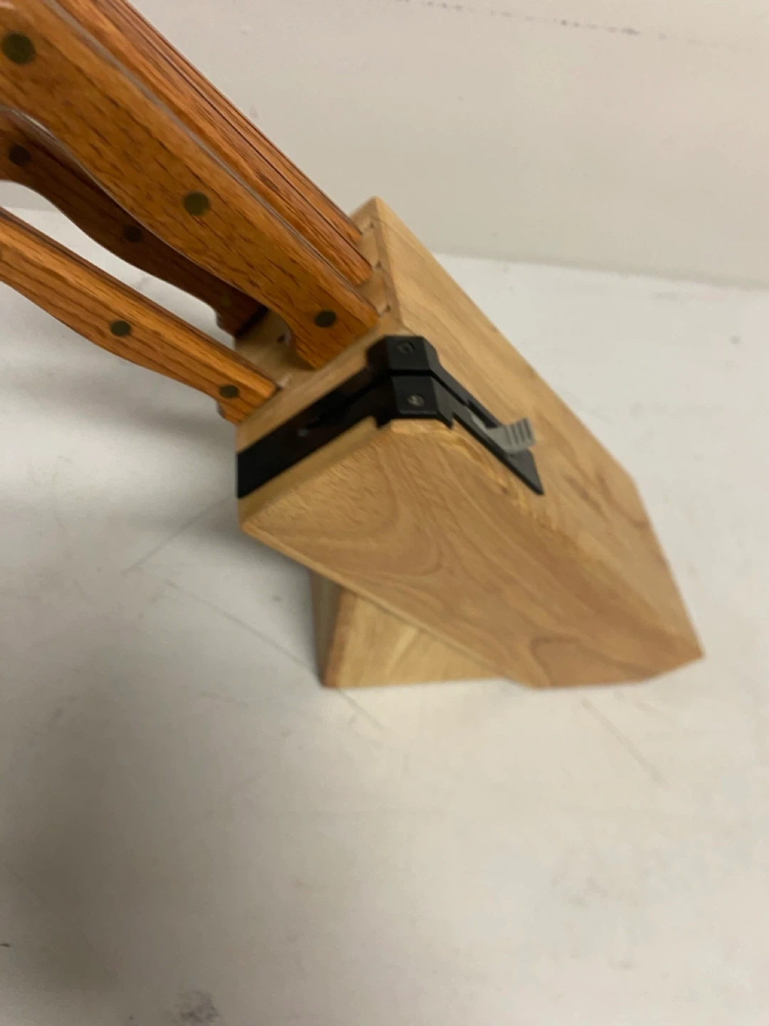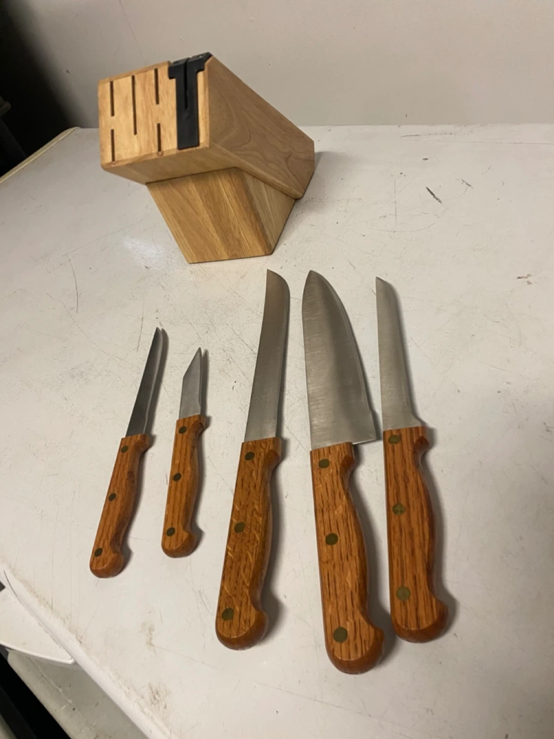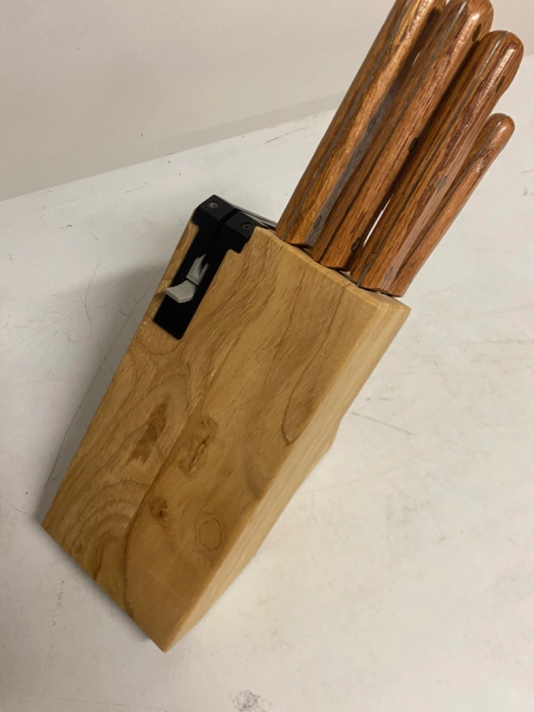 Selling a wooden knife block set. It's in great shape and ready for a new home! Perfect for keeping your knives organized and accessible in the kitchen