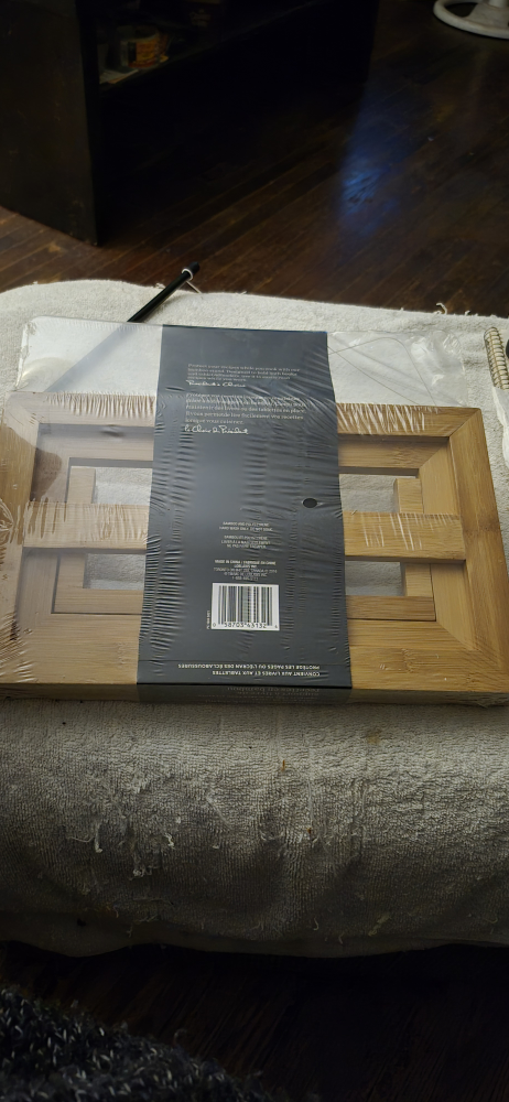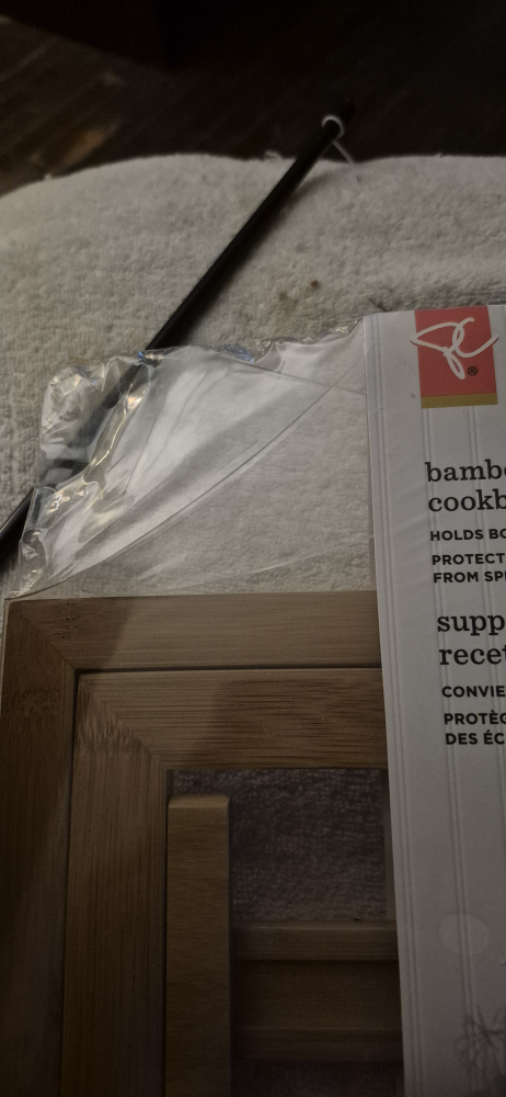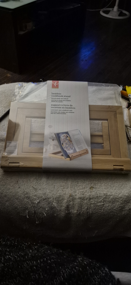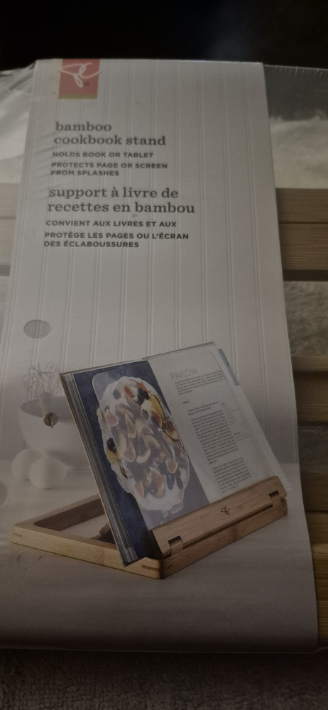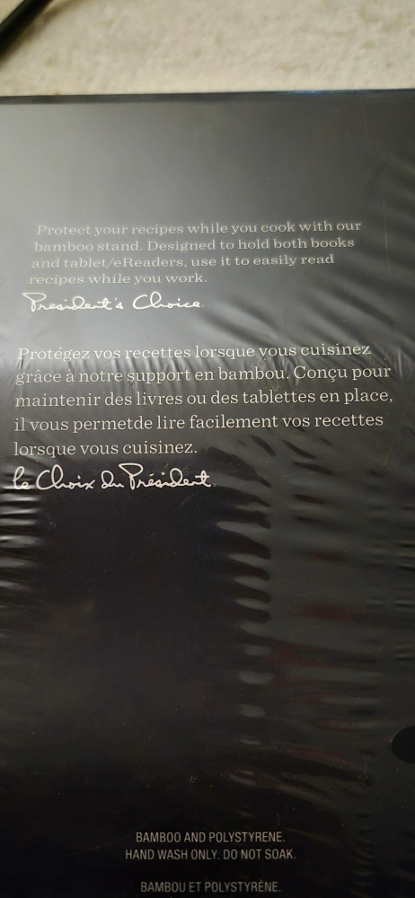 Selling a brand new President's Choice bamboo cookbook stand, still sealed in its original packaging! It's designed to hold both books and tablets while you're cooking, protecting them from splashes. Made of bamboo and polystyrene.