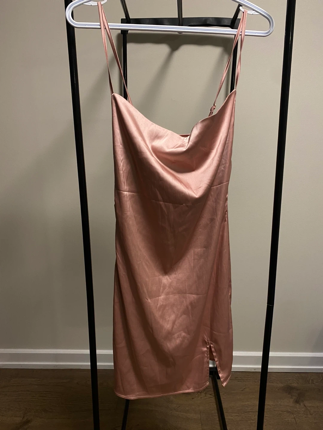 10Selling a cute pink slip dress! It's in great condition and perfect for a night out or a special occasion. The material is soft and flowy, and it has a flattering silhouette.