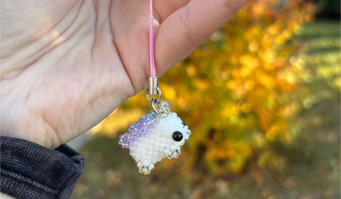 Selling a cute, handmade beaded animal charm! It's in great condition and would be perfect for a phone or bag accessory. The charm features a white body with black eyes and a pink strap.
