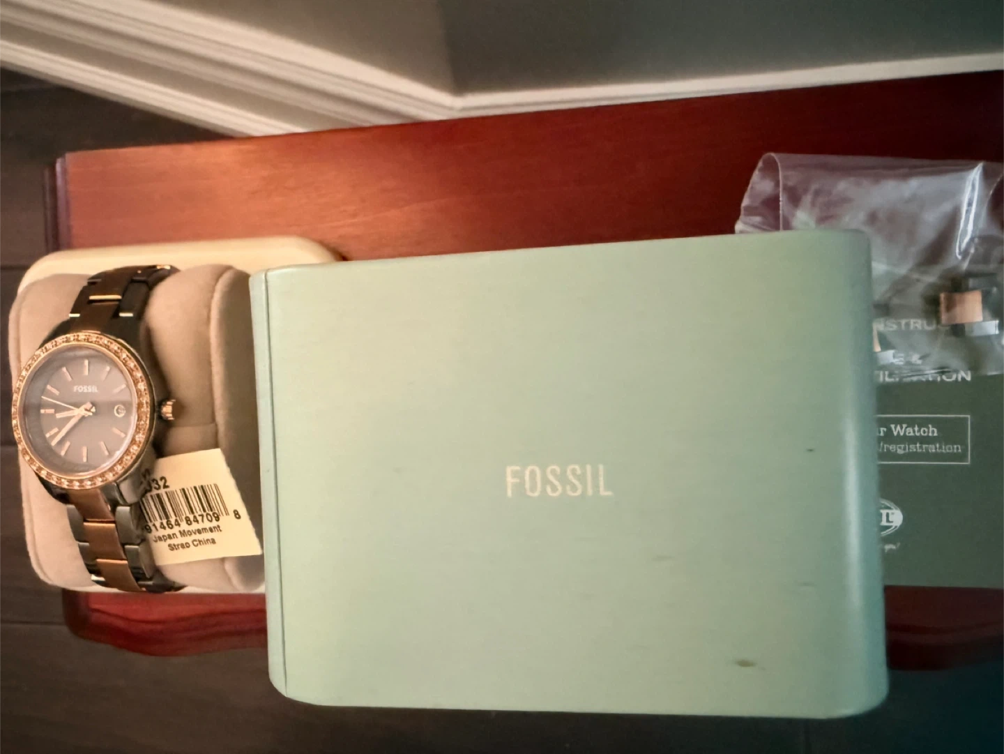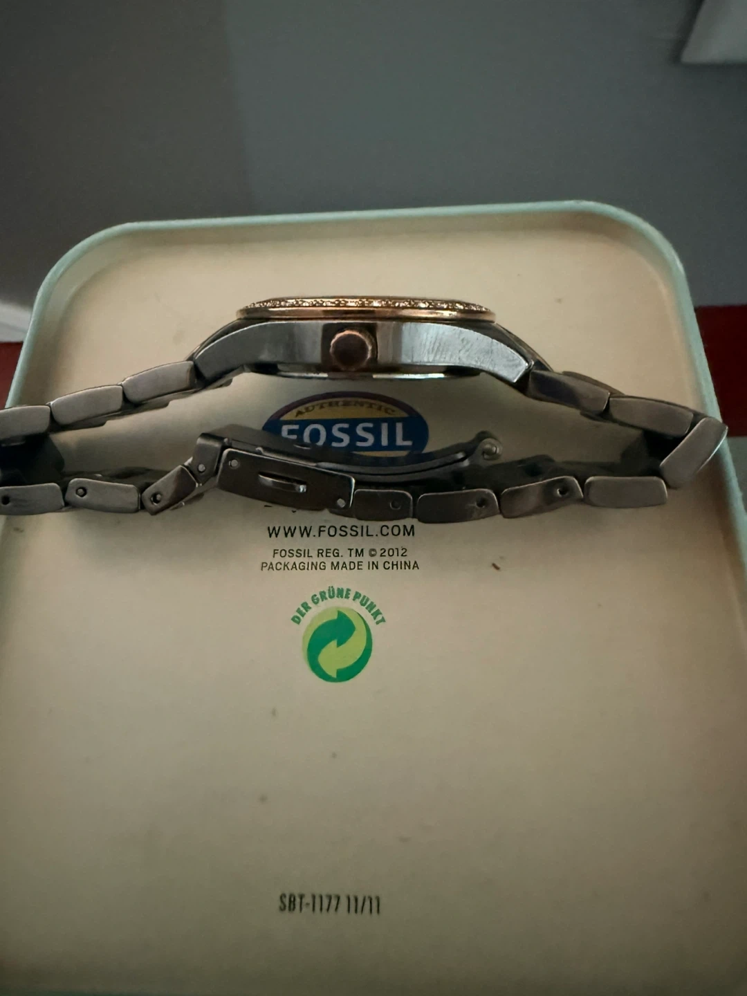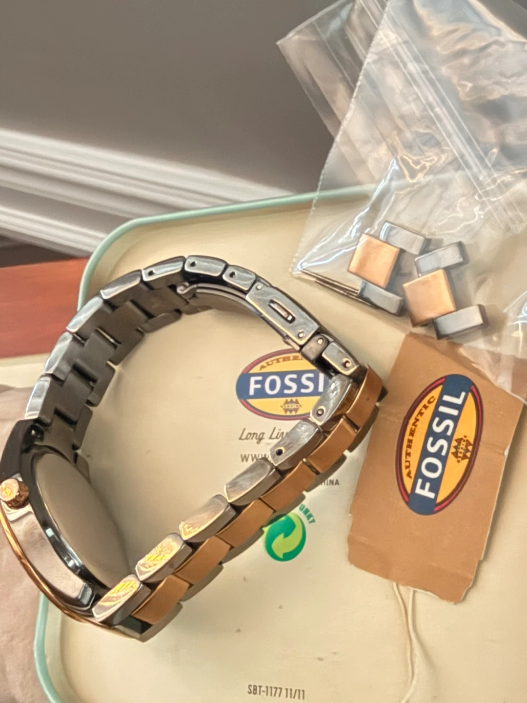 The battery has died. Few links have been removed so is small but the original links are in the Fossil box to make the wristband bigger .