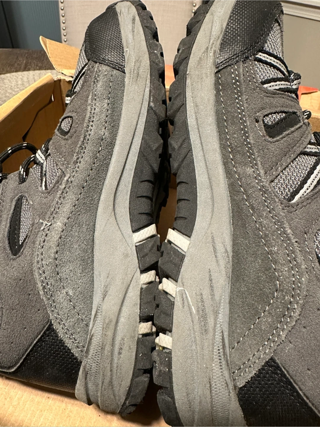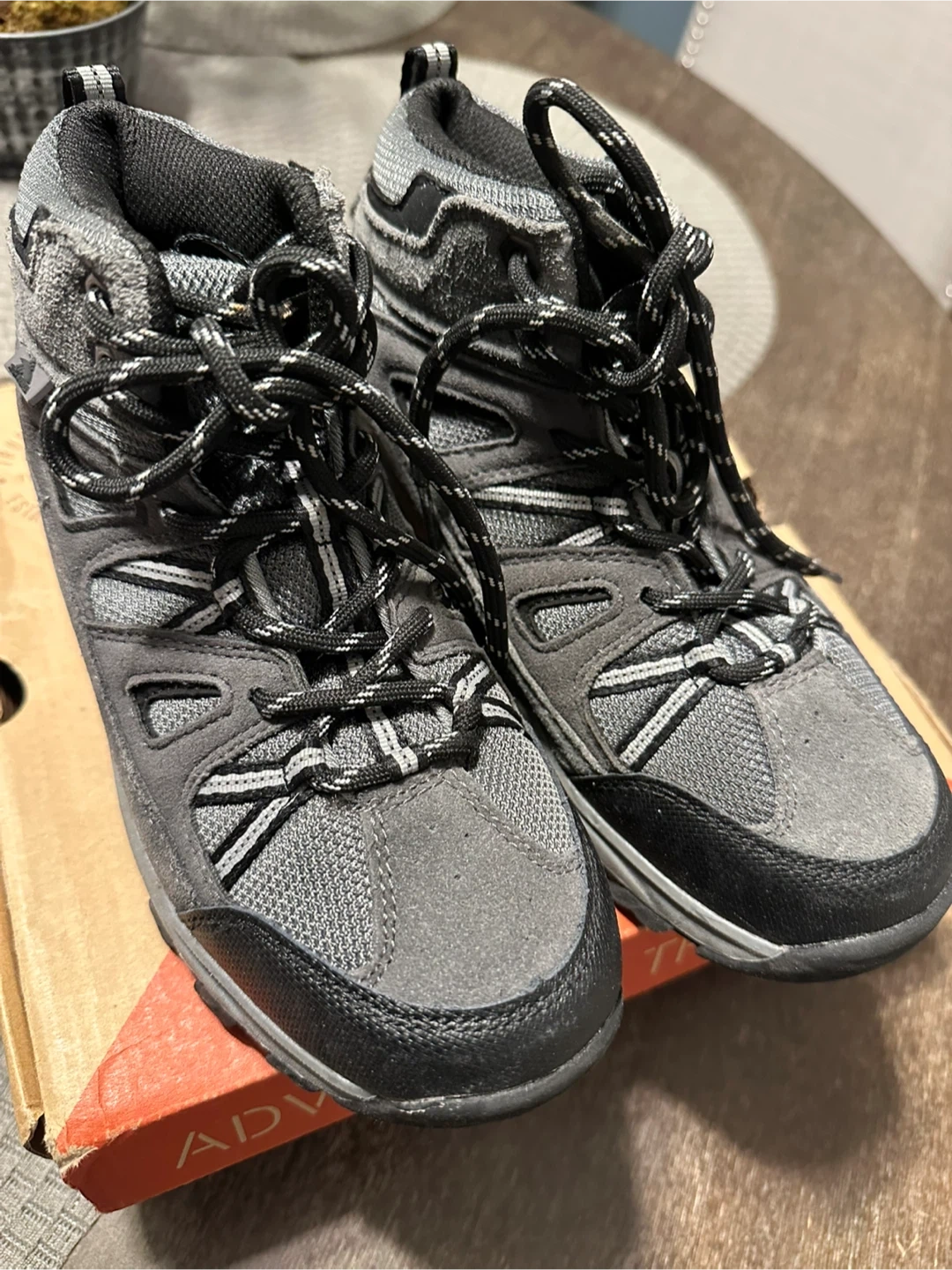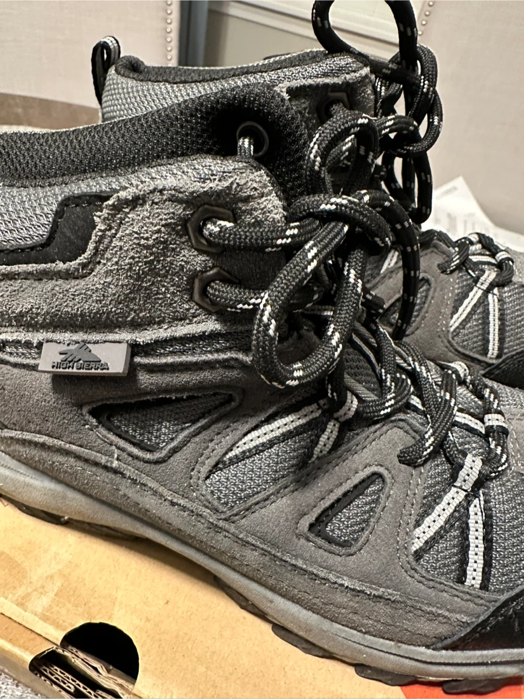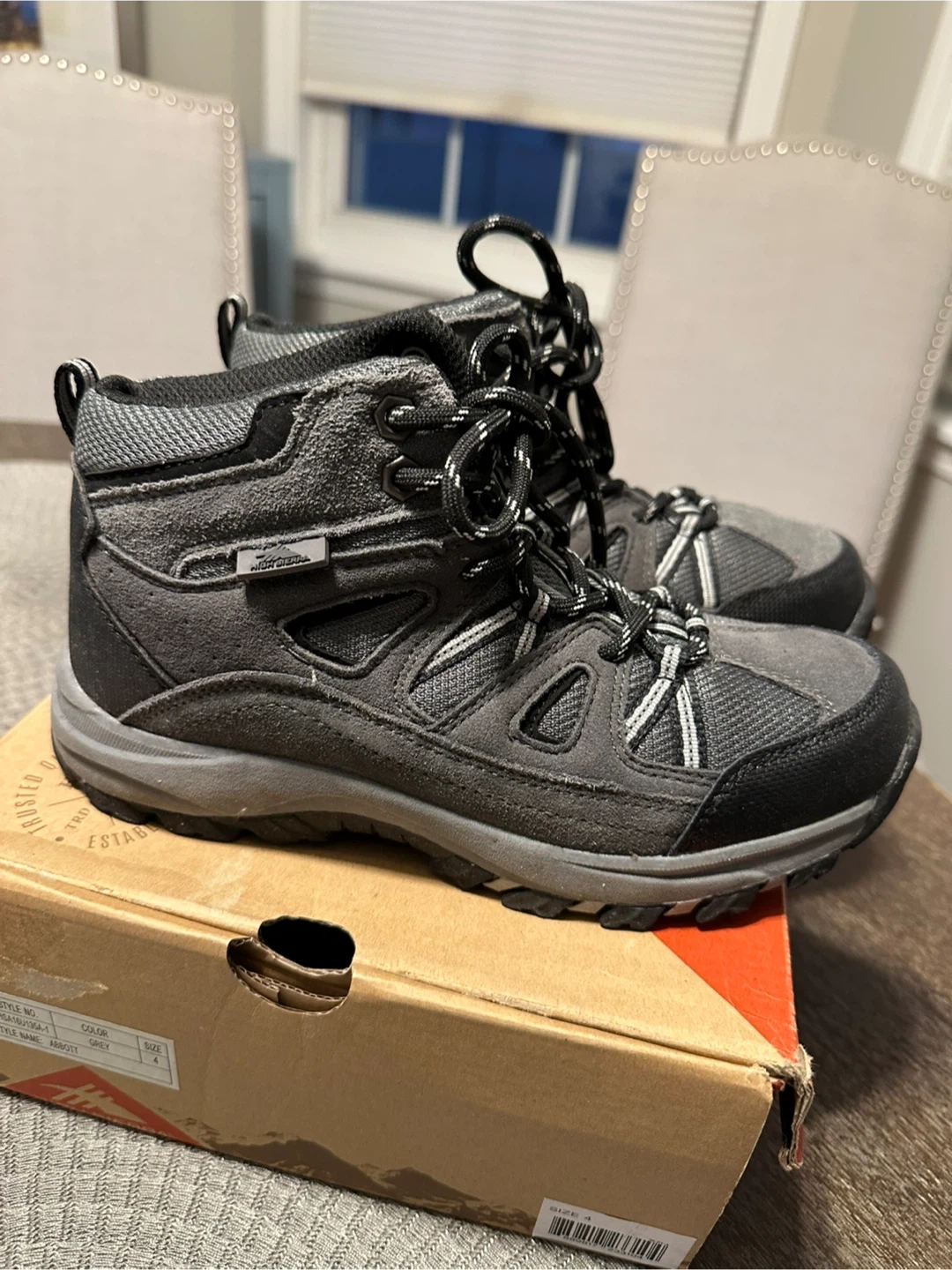 Get ready for your next adventure with these High Sierra Abbott hiking boots! They are a stylish gray color and come in a size 4 . New in box but some scuffs on one side of soles. Can be great for winter shoes too .